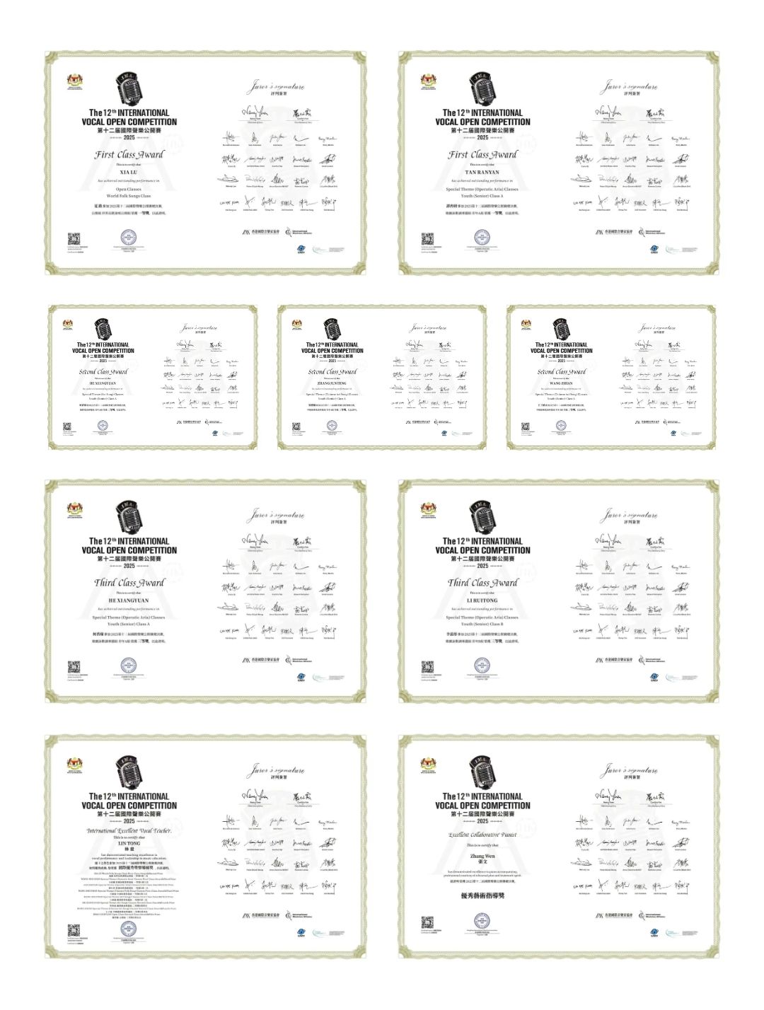 bw必威西汉姆联官方网站音乐学院声歌系师生喜获佳绩:硕士研究生夏路荣获世界民歌演唱公开组一等奖,硕士研究生谭冉妍荣获歌剧咏叹调专题组青年A组一等奖,硕士研究生何香缘获得艺术歌曲专题组青年A组二等奖,硕士研究生张骏腾获得中国艺术歌曲专题组青年A组二等奖,本科生王子涵获得中国艺术歌曲专题组青年A组二等奖,硕士研究生何香缘获得歌剧咏叹调专题组青年A组三等奖,硕士研究生李蕊彤获得歌剧咏叹调专题组青年B组三等奖 ;林童教授荣获“国际优秀声乐导师奖”,青年教师张文荣获“优秀艺术指导奖”。