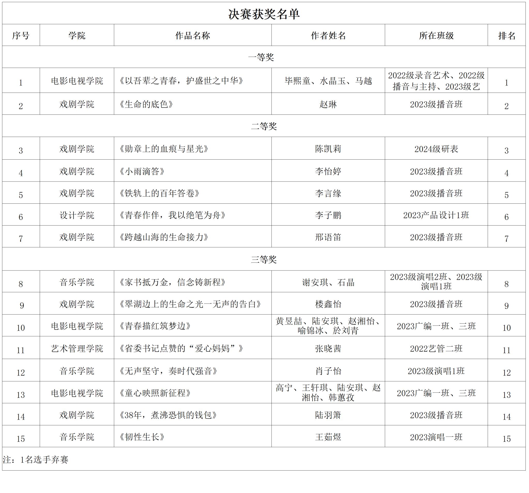 经过院级初赛和校级复赛,共16组同学进入决赛。选手们围绕照片,或激情澎湃,或温情动人,讲述了一个个与时代同频共振的青春故事,展现出新时代大学生昂扬向上的精神风貌。最终,电影电视学院《以吾辈之青春,护盛世之中华》和戏剧学院《生命的底色》获一等奖。