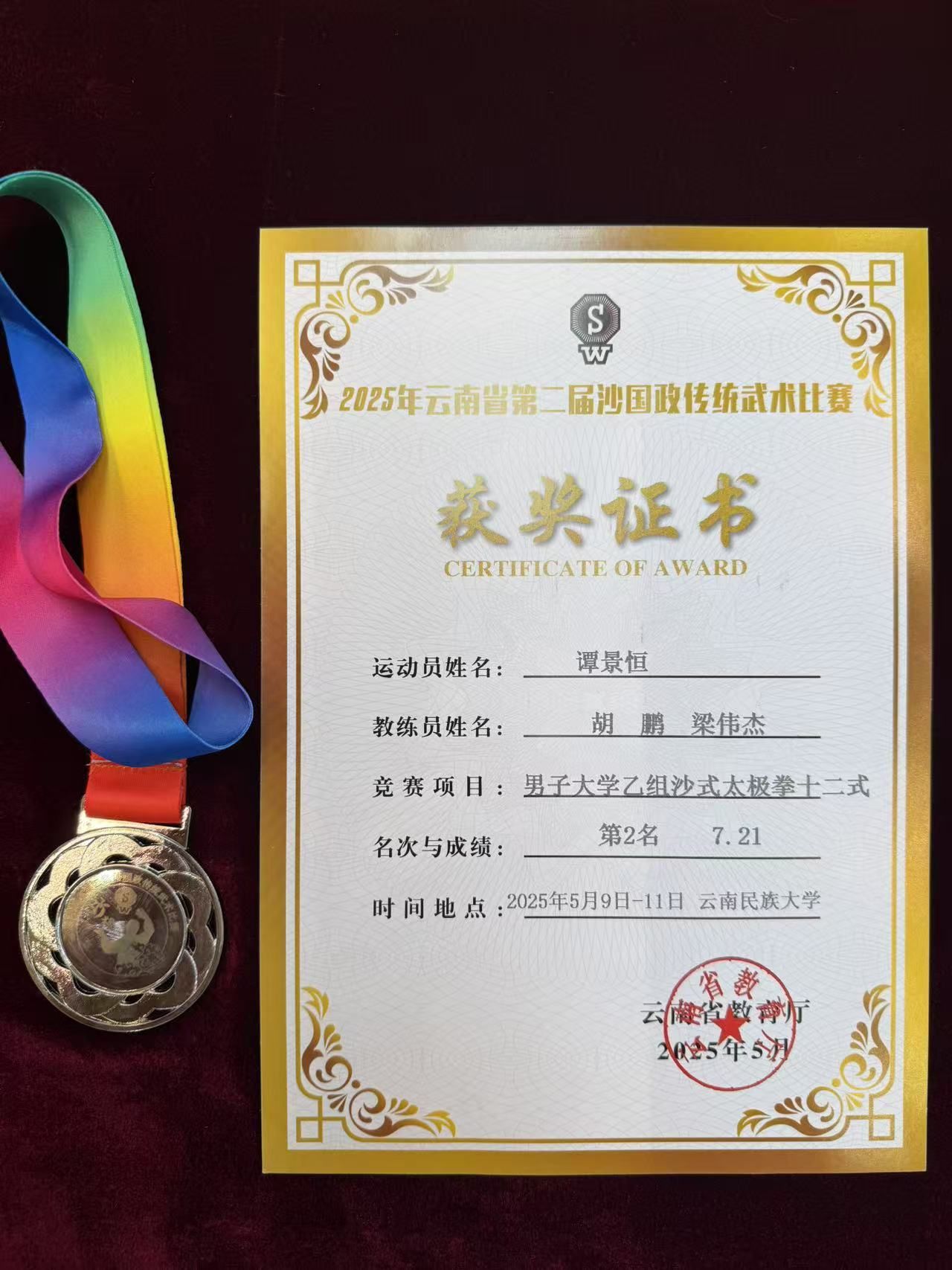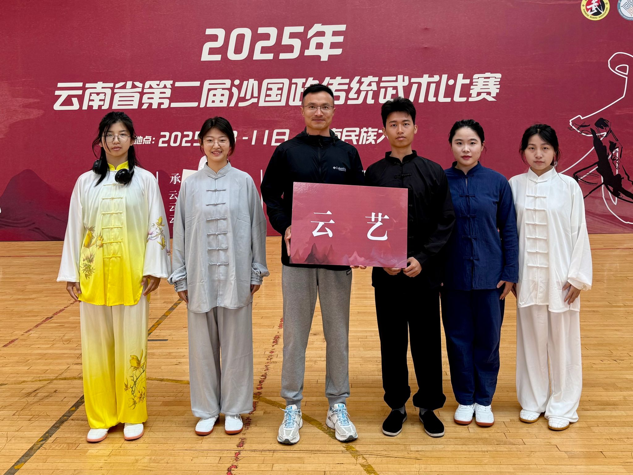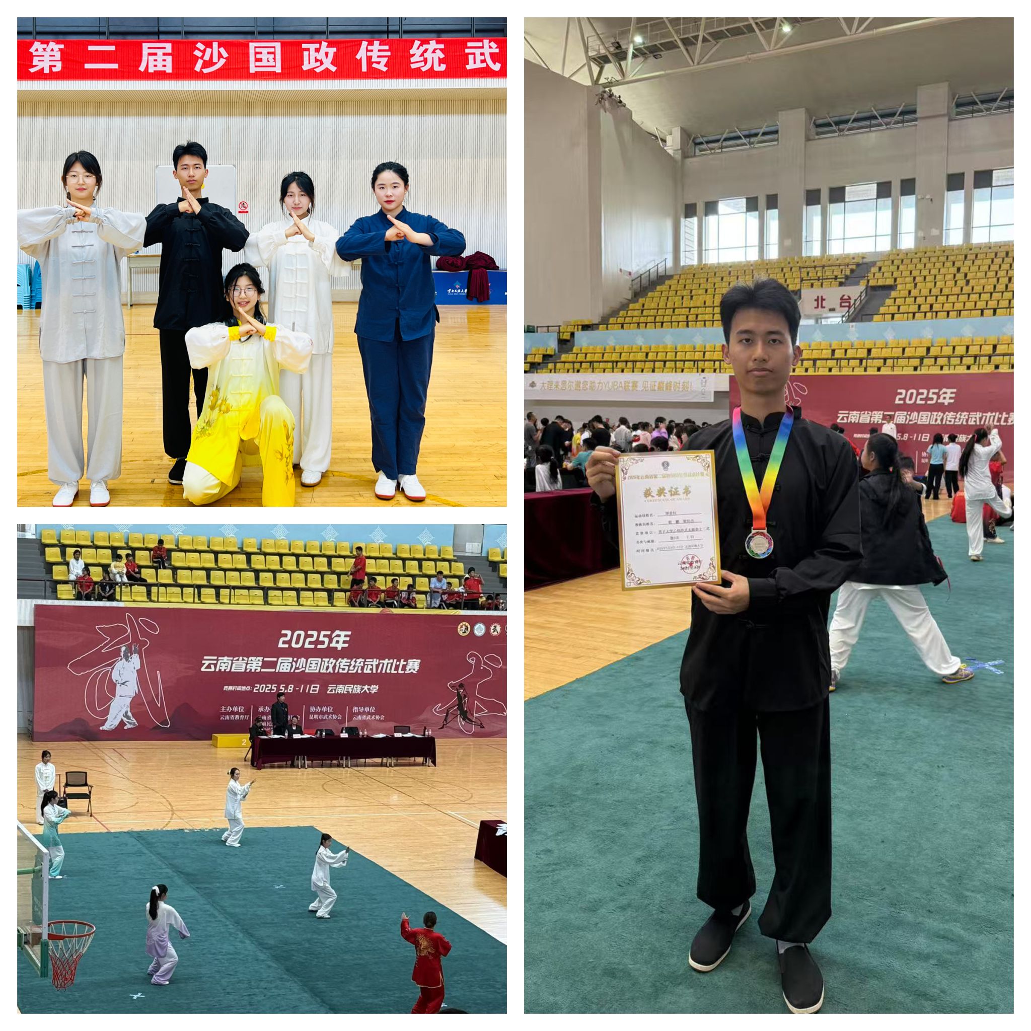2025年5月9日至11日,云南省教育厅主办的“云南省第二届沙国政传统武术比赛”在云南民族大学举行,本次比赛汇集了云南省80家单位共计716名队员参赛。我校学生武术代表队在学校领导的关心和支持下,由体育教学部石刚老师领队,胡鹏、梁伟杰两位老师带队参赛。比赛期间,我校队员沉着冷静,不惧对手,其中谭景恒同学在沙式太极拳12式项目中获得亚军一项,其他队员分别获第四名、第五名、第六名各一项。