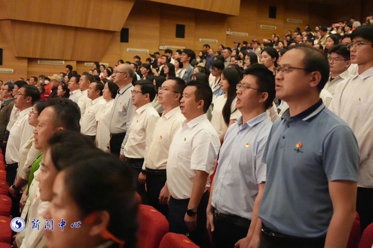 全体党员齐唱《没有共产党就没有新中国》,表达对党的无限热爱与崇高敬意,将现场气氛推向高潮。