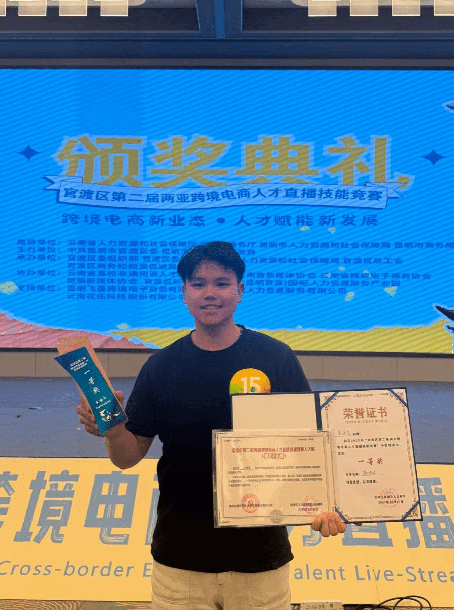 10月17日,由云南省人力资源和社会保障厅、云南省商务厅、昆明市人力资源和社会保障局、昆明市商务局指导的官渡区对外贸易产业跨境电商人才活动暨第二届两亚跨境电商人才直播技能竞赛,在云南(昆明官渡)国际人力资源服务产业园圆满落下帷幕。我校艺术管理学院2026届毕业生朱泽荃以出色表现荣获第一名,学校招生与就业处获本次比赛优秀组织奖。赛后,朱泽荃将与其他优秀选手一起入选官渡区南亚东南亚跨境电商人才库,获得持续的职业发展支持。这一机制不仅为获奖选手提供了更广阔的发展平台,也为区域经济发展注入了新活力。