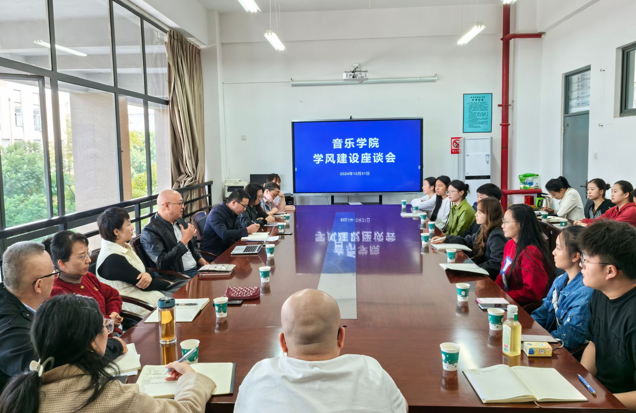 为进一步加强和改进学风建设,培育优良学风,提升学院人才培养质量,音乐学院于2024年10月31日在A301会议室召开了师生代表座谈会,音乐学院党委书记童汝全、院长林林、副院长侯静宜、各科室负责人和师生代表参加座谈会,座谈会由党委副书记肖本俊主持。
