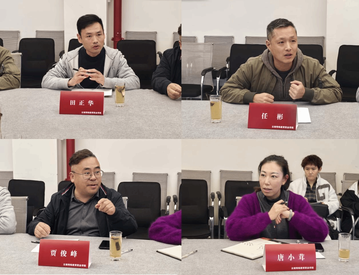 云南特殊教育职业学院莅临交流的各位领导对美术学院在艺术教育领域取得的成就给予高度评价。并就如何更好地帮助特殊教育师生拓宽教育视野、提升教育层次、丰富教学内容、增强科研能力进行交流发言。云南特殊教育职业学院教务处田正华处长围绕学院发展和教师发展讲到,在特殊教育领域,云南特殊教育职业学院有其重要时代使命和社会责任。希望通过校际合作、互鉴交流能进一步提升特殊教育的整体水平。云南特殊教育职业学院艺术学院任彬书记、唐小茸院长、保卫处贾俊峰处长从人才培养、学历提升、教师帮扶、专业支持、课程建设、教学互动等方面作了交流发言。他们表示,特殊教育学生同样拥有丰富的艺术天赋和独特的创造能力,希望通过与美术学院的合作,能进一步提升他们的艺术素养和专业能力。