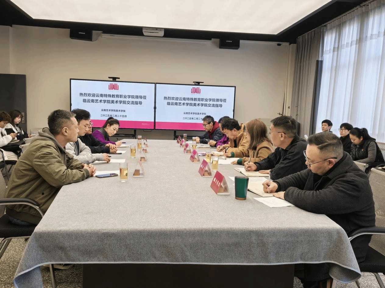 25日上午10:00,美术学院刘恩权书记、曹悦院长、何君副书记、张炜副院长、沐晓熔副院长等领导热情接待了云南特殊教育职业学院教务处、艺术学院领导一行,并陪同参观美术学院教学设施、教学空间及艺术创作工作室。
