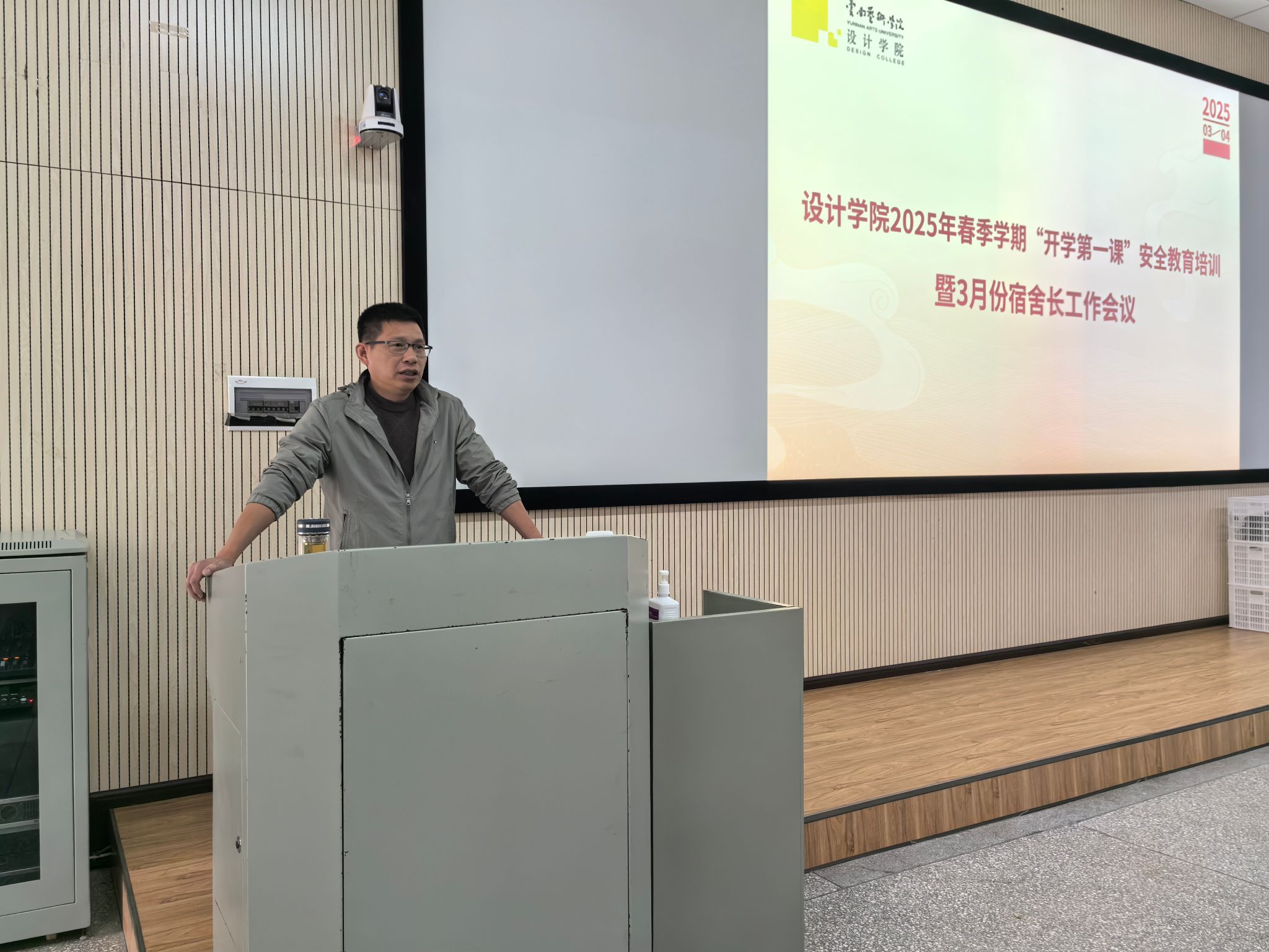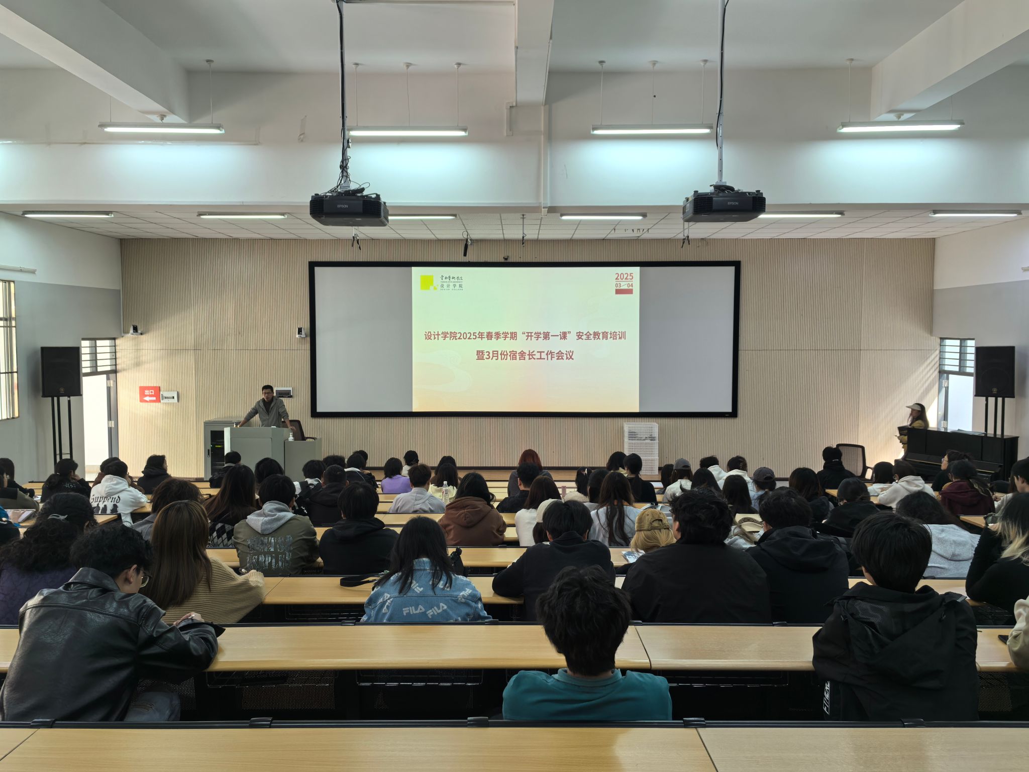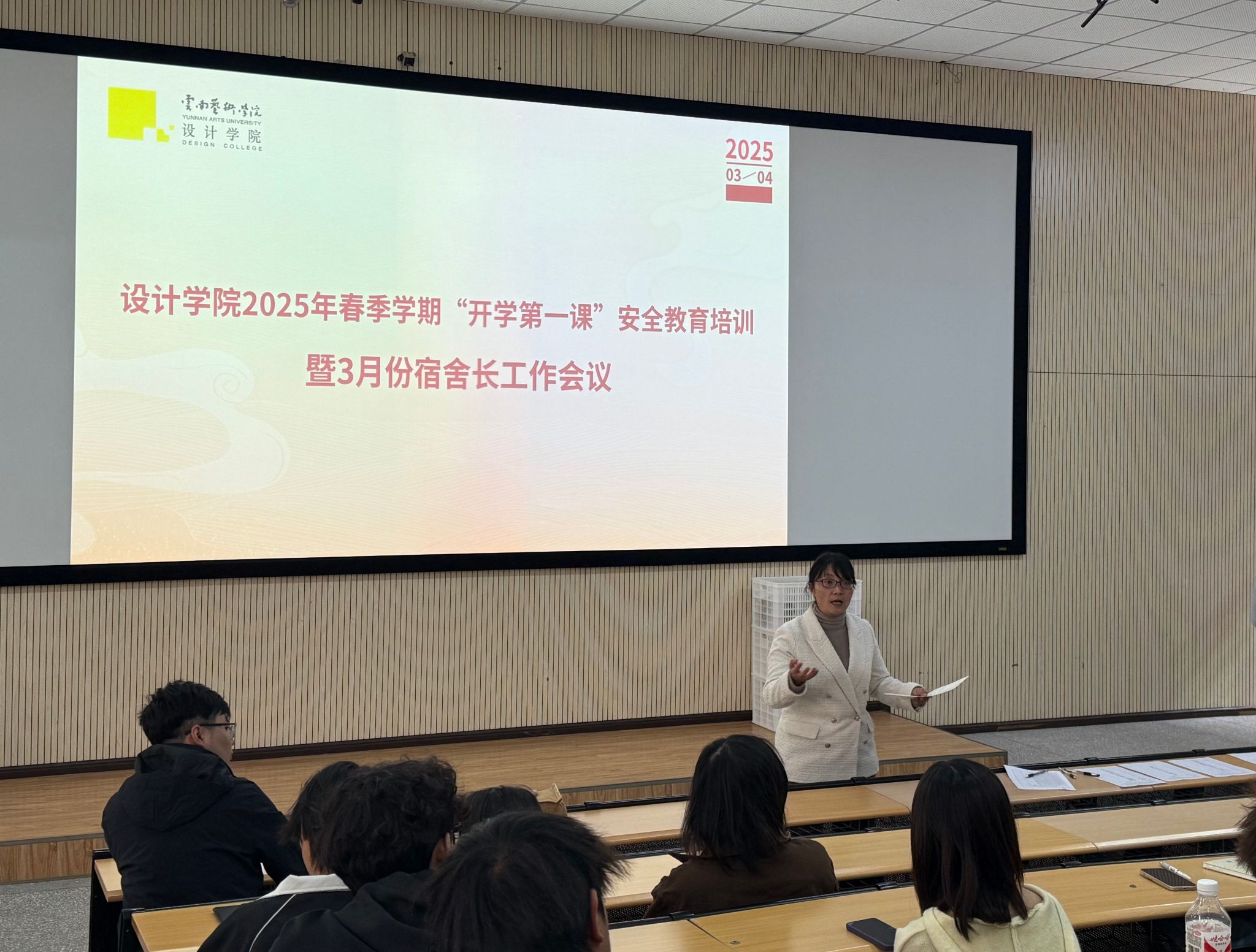 根据学校2025年春季学期开学工作准备会议要求,确保开学初期同学们在返校后从思想上、身心上及时调整状态,在行为上回归正常校园生活,严格遵守校纪校规,时刻关注自身安全,努力刻苦学习。设计学院于2025年3月4日在公共教学楼视听教室召开2025年春季学期“开学第一课”安全教育培训暨3月份宿舍长工作会议。安全教育培训邀请了bw必威西汉姆联官方网站保卫处治安科科长何斌作为主讲老师,设计学院党委副书记欧阳继梅、各年级辅导员出席会议。