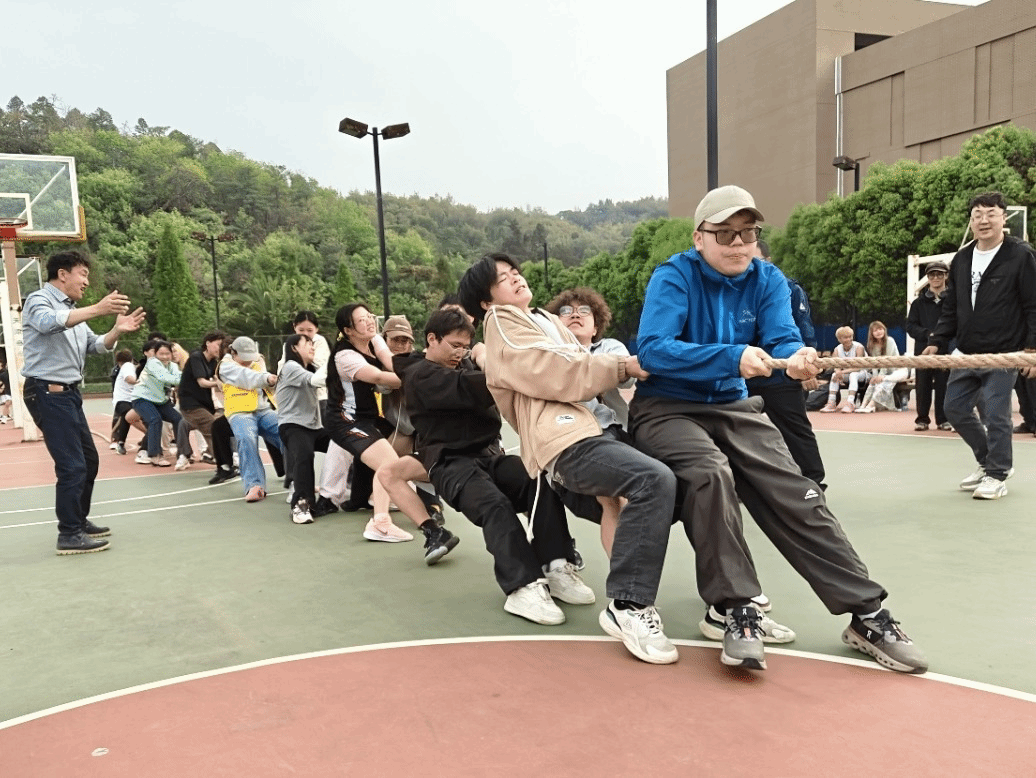 拔河场上,双方队员紧握长绳,身体后倾,将全身的力气凝聚在紧握绳子的双手上。随着裁判的一声哨响,空气中爆发出一股紧张而激烈的气息,绳子中间的红绸带在两队之间来回摇摆,同学们的加油声、呐喊声此起彼伏,为这场力量与意志的较量增添了无限激情。