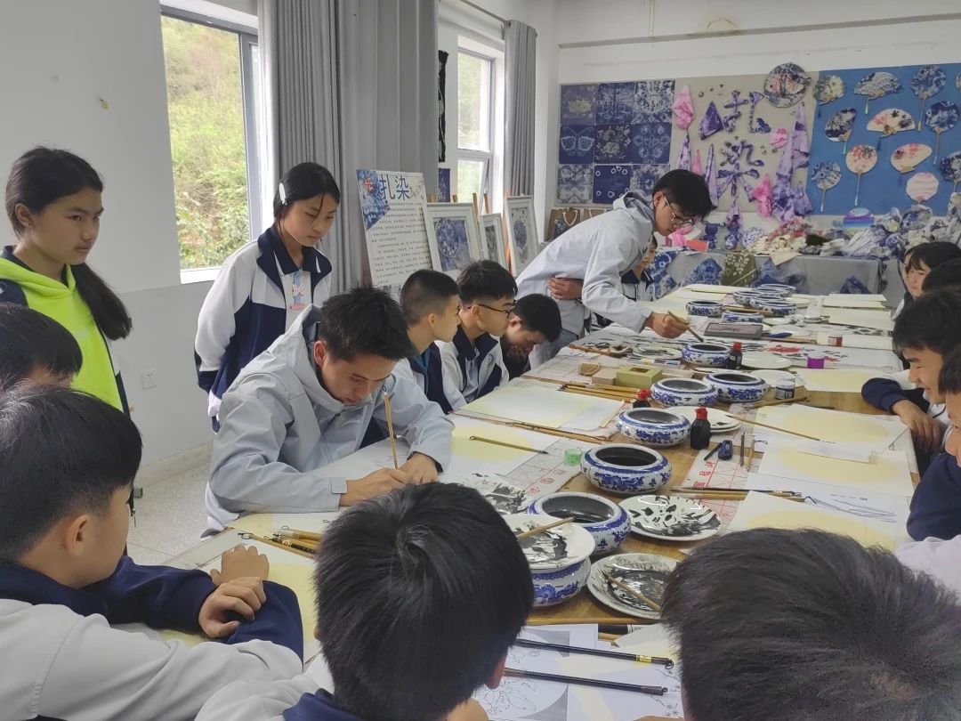 为了进一步丰富课程内容,提升教学质量,bw必威西汉姆联官方网站美术学院中国画专业的罗旺同学也利用自己的课余时间,从田蓬镇田蓬中心小学来到富宁思源实验学校,他与胡尊尊同学在课下进行了深入的交流和探讨,他们针对如何利用一个课时40分钟的时间,开展一堂生动、高效、全面的中国画课程进行了反复推敲。最后,决定在艺术课堂上进行联动教学,共同为富宁思源实验学校的学生们讲解和示范中国工笔画与写意画的相通之处以及二者不同的艺术表现形式,并指导学生进行实践。这种创新的教学模式,不仅让学生们领略了中国画不同表现技法的魅力,更培养了他们的艺术鉴赏能力和创造力。此外,富宁县驻点师生借这次机会齐聚富宁思源实验学校,开启了一场水墨之旅。