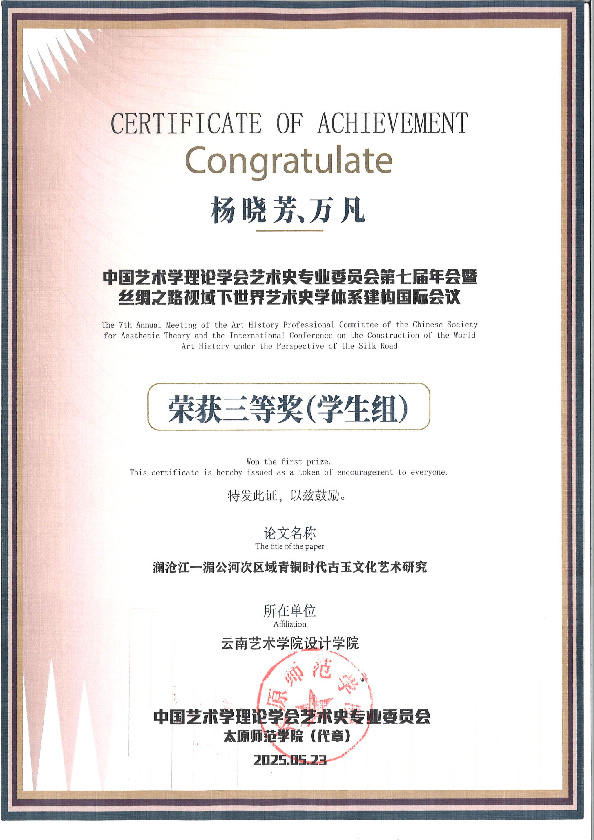2025年中国艺术学理论学会艺术史专业委员会第七届年会暨“丝绸之路视域下世界艺术史学体系建构”国际会议,于2025年5月23日至25日在太原师范学院召开。我校设计学院院长万凡教授及2022级研究生杨晓芳所著论文《澜沧江——湄公河区域青铜时代古玉文化艺术研究》,经专家委员会多轮评审,成功入选会议主议题下的分论坛报告序列,并获得硕博组三等奖。