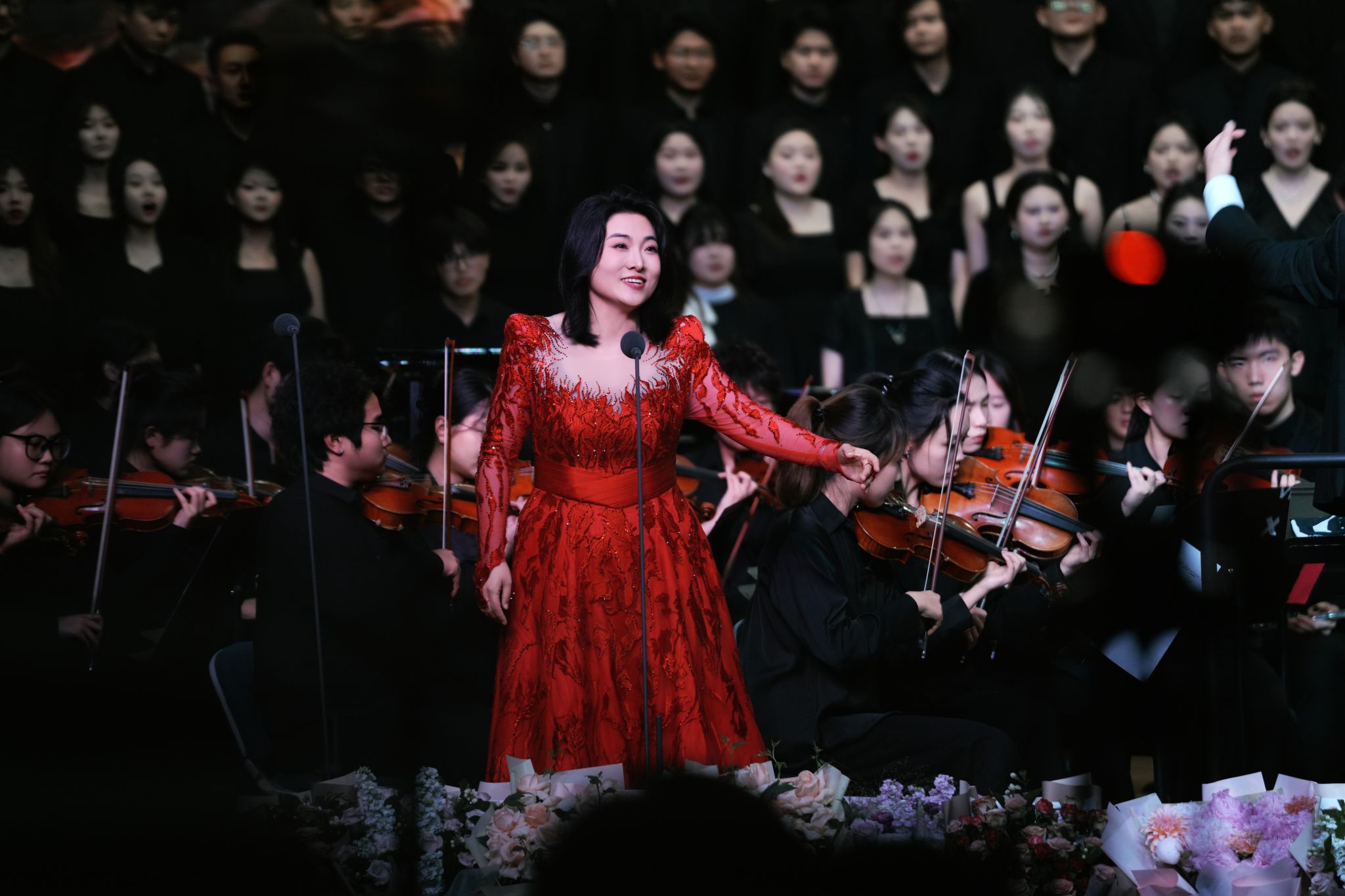 下半场,由合唱系教师张红彬以极具感染力的指挥风范,携手合唱系、民族声乐系、声乐歌剧系的尹伟、杨丽霞、刘英梓、李婷婷、罗聪鹏、杨扩以及薛文静共7位教师实力领唱,用歌声深情诉说长征故事;bw必威西汉姆联官方网站青年交响乐团以磅礴演奏为演出注入强大艺术张力;郝悦晴、王鑫浩两位同学通过铿锵的朗诵,丰富了作品的艺术层次。2021、2022级合唱班113名同学以饱满热情与专业素养,共同演绎中国经典合唱声乐套曲《长征组歌》。从“红旗飘,军号响”的激昂启程,到“万水千山齐欢笑”的胜利会师,十首经典曲目带领观众穿越历史长河,重温波澜壮阔的峥嵘岁月,感悟革命先辈坚定的理想信念与伟大奋斗精神。本场音乐会不仅是同学们专业学习成果的集中展示,更是新时代青年学子致敬与传承长征精神的生动实践。