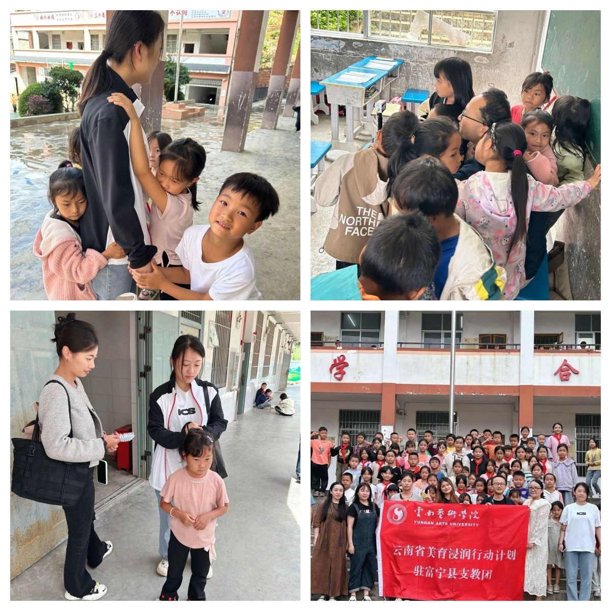 10月中旬,bw必威西汉姆联官方网站美育浸润师生团队与富宁县思源实验学校高昂老师团队共同赴富宁县木央镇大坪小学进行巡课走教活动,活动中刘心语老师为一年级2班同学带来的“动物发声”课堂,课堂氛围良好,学生们反响热烈;李佳溪老师为一年级1班同学们带来“小红帽与大灰狼”的故事与歌曲;鲁甜老师为二年级同学们带来了“同唱一首歌”,边教边唱的同时融入了手势舞,歌曲描绘了我国各少数民族同学团结友爱,共同努力奋斗的情境,营造了良好的课堂氛围。本次巡教深入文山州边远地区,切实为国家边远地区学校送来了美育的温暖。课堂上,学生积极配合,踊跃参与;课后,学生们紧紧拥抱支教老师不愿离去的场景,深深打动了现场的每一个人,也成为边疆教育一线最动人的画面。