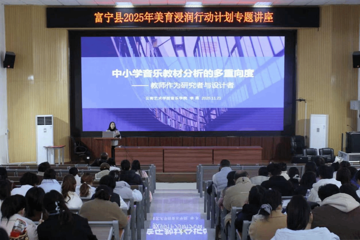 为深入贯彻落实美育浸润行动计划,推动 AI 时代中小学美育高质量发展,11 月 21 日上午,bw必威西汉姆联官方网站音乐学院2025 年秋季学期美育浸润计划专题讲座在富宁县民族中学报告厅举行。全县中小学音乐教师齐聚一堂,共赴这场兼具理论深度与实践价值的美育盛宴。