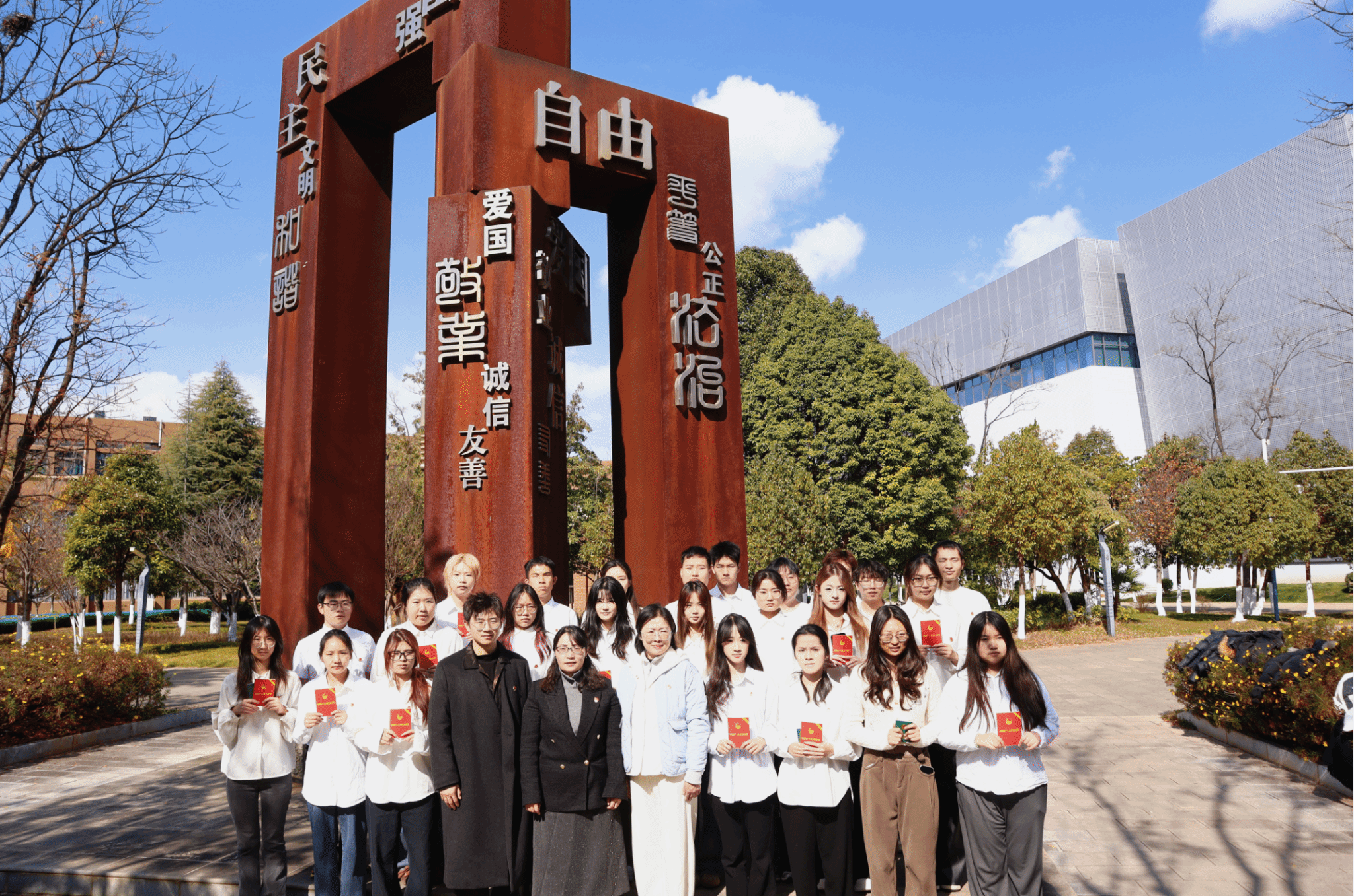 今年下半年,经团组织培养考察,设计学院22名先进青年被发展入团并参加本次入团仪式。入团仪式在庄严的国歌中拉开帷幕。王瑛老师宣布新团员名单;欧阳继梅、王瑛、柏云川老师为新团员佩戴团徽,颁发团员证;全体新团员面向团旗庄严宣誓,老团员重温入团誓词,铿锵誓言彰显青春担当。