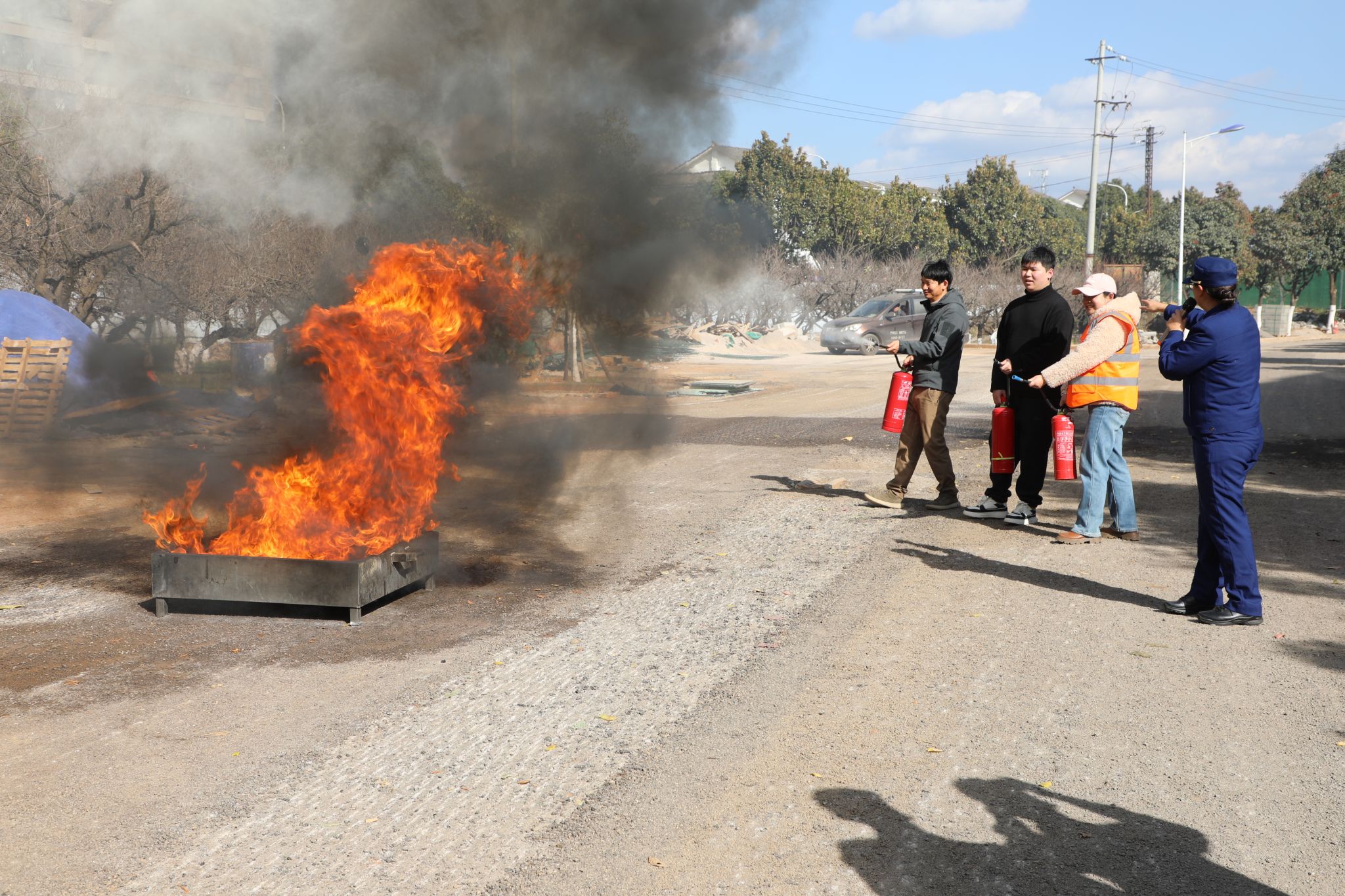 疏散演练结束后,全体参加演练的师生转移至学校5号楼旁空地参加灭火演练。消防员结合实战需求,现场开展消防器材实操教学,系统演示了灭火器、消火栓及呼吸罩的正确使用方法。在专业指导下,教师及学生代表共20余人分批次进行了灭火器实操演练,亲身体验了灭火过程,进一步掌握了消防器材的实际应用技能。