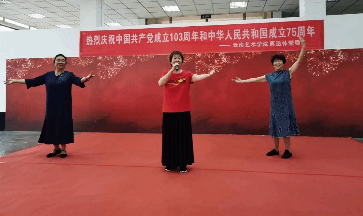 离退休教工第二党支部杨婉华、张懋宁、李丽熙歌伴舞《再唱山歌给党听》