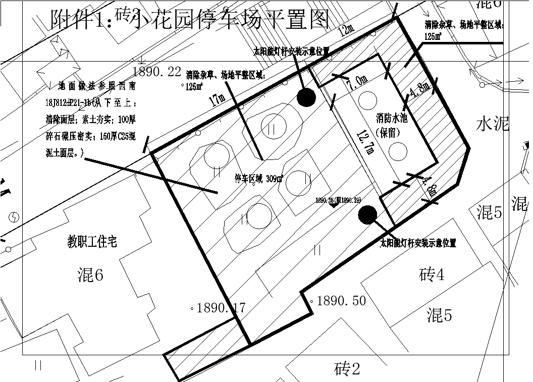(2)拟改造停车场区域靠住宅一侧:保留长势完好且具有价值的4棵柏树,清除原地面已铺设的碎块地砖,按照要求清除到基层,铺设排水管并预留排水口篦子,混凝土浇筑成为停车场,停车场排水坡度控制在2‰ ,排水方向为预留排水口篦子方向。排水篦子及排水管的铺设根据现场实际情况按照就近原则排入场地附近场地雨水篦子或雨水沟。排水管可按照φ100PVC管预埋。
