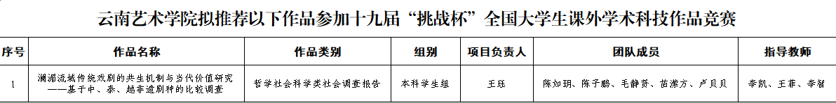按照竞赛要求,根据省赛终审决赛评审结果,拟推荐我校省赛特等奖项目参加第十九届“挑战杯”全国大学生课外学术科技作品竞赛,现将项目情况公示如下: