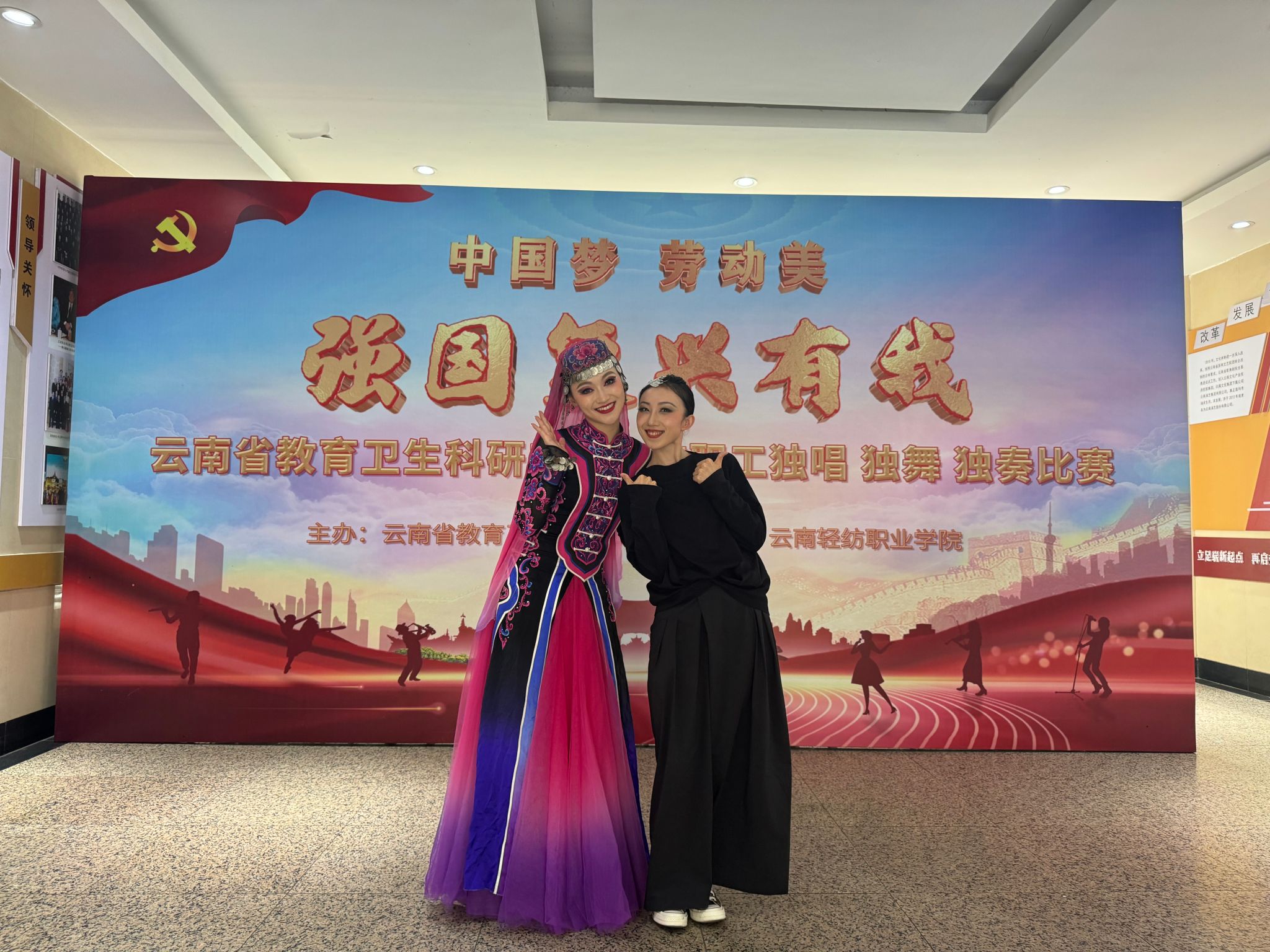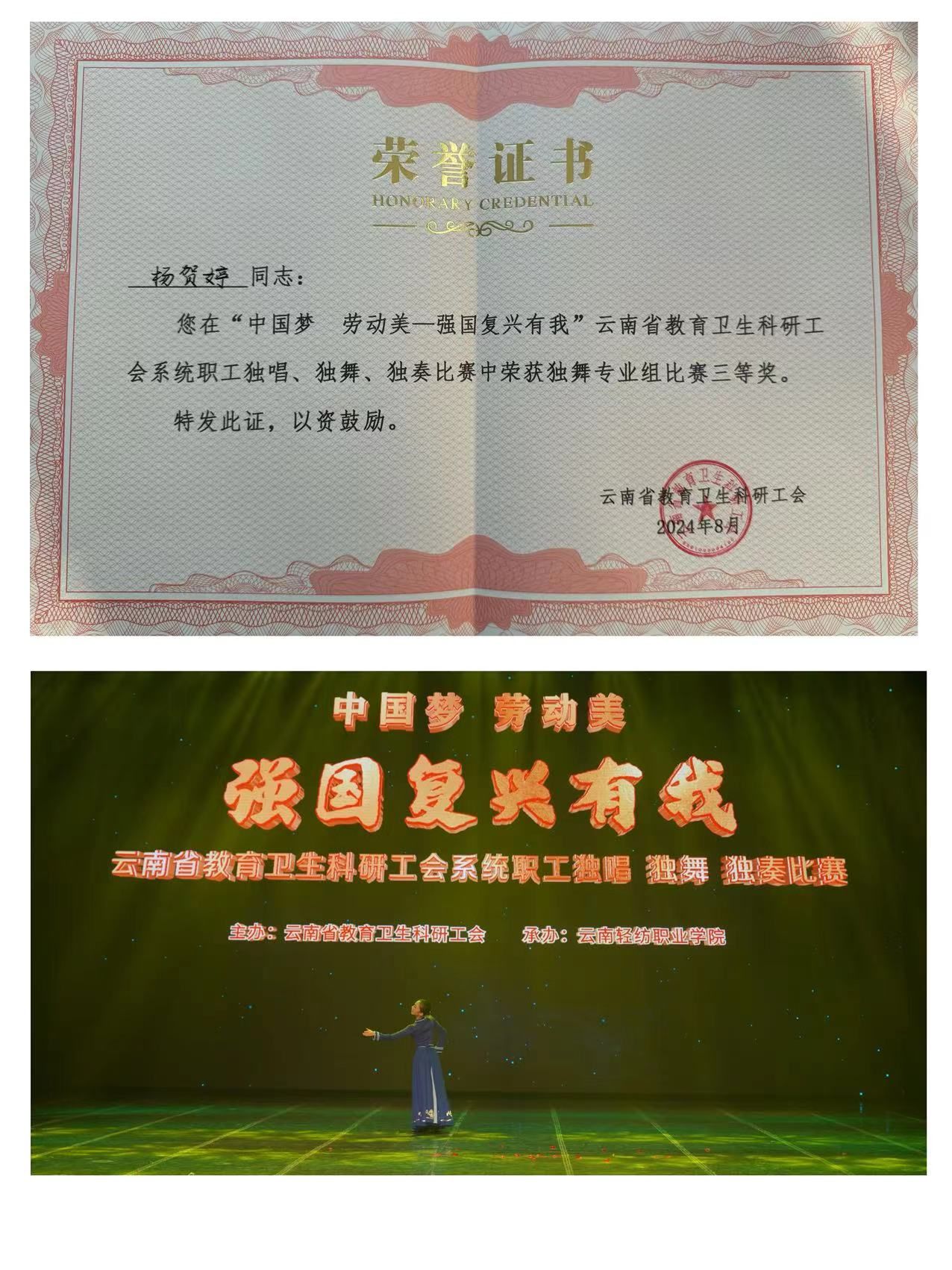 近日,云南省总工会以庆祝中华人民共和国成立75周年为重要契机开展系列活动,举办以“中国梦·劳动美·强国复兴有我”为主题的云南省职工独唱、独舞、独奏比赛。bw必威西汉姆联官方网站舞蹈学院青年教师者子楠和杨贺婷分别荣获云南省教育卫生科研工会举办的“三独”比赛专业组“一等奖”和“三等奖”(排名第一和第三)。最终,者子楠代表云南省教育卫生科研工会参加云南省总工会举办的“三独”比赛,荣获“二等奖”。