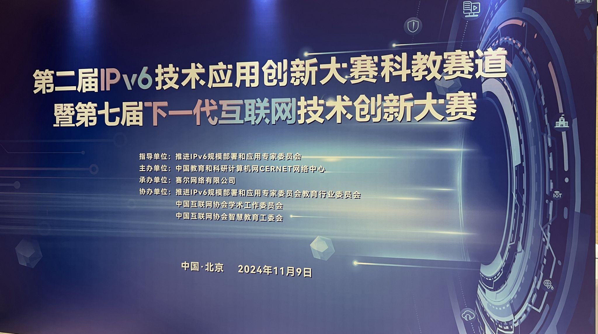 2024年11月9日,以“科教融合,创新发展”为主题,由推进IPv6规模部署和应用专家委员会指导,中国教育和科研计算机网CERNET网络中心主办,赛尔网络有限公司承办的第二届IPv6技术应用创新大赛科教赛道暨第七届下一代互联网技术创新大赛在北京“下一代互联网及重大应用技术创新园”落下帷幕。我校《基于IPv6技术的数字孪生校园应用创新与实践》项目荣获产业应用组二等奖。