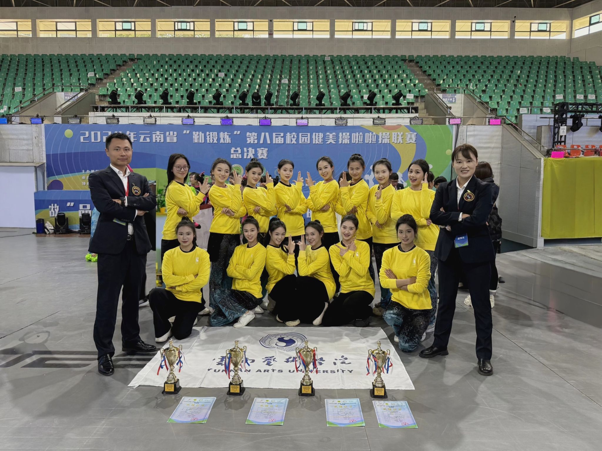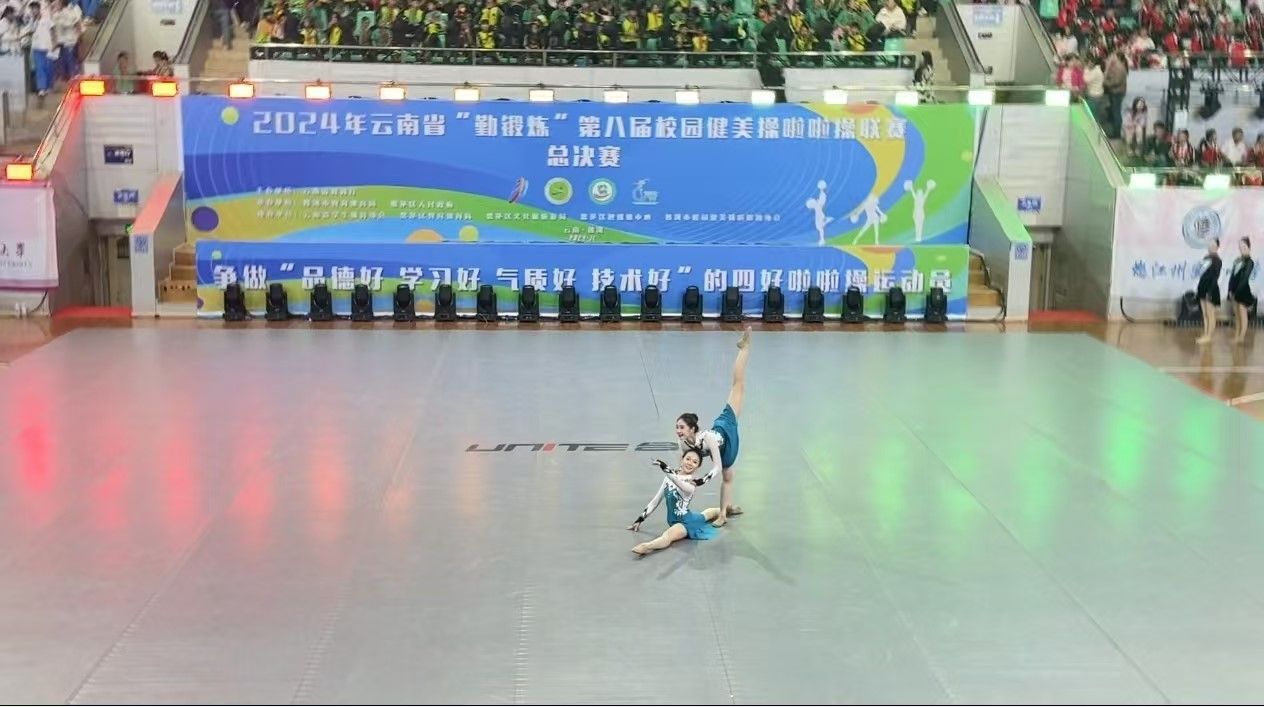 2024年云南省“勤锻炼”第八届校园健美操啦啦操联赛总决赛于11月15日-17日在普洱市思茅区举行,本次比赛由云南省教育厅主办,普洱市教育体育局、思茅区人民政府承办。本次比赛有来自全省各州、市的110支队伍3155名运动员参加。我校体育教学部组队参赛,由石刚老师担任领队,崔雅平、肖镜明两位老师带队,选派14名队员参与健美操、啦啦操2个大项6个小项的比赛,经过两天的激烈争夺,最终拿下阳光组(非体育专业组)健美操项目:《2019年版健美操大众锻炼标准》3级、《竞技健美操自编动作(三人操)》,啦啦操项目:《2020版全国啦啦操规定动作》爵士4级、啦啦操自编动作《集体爵士》、《双人花球》、《双人爵士》6个项目的冠军。