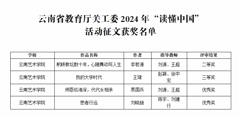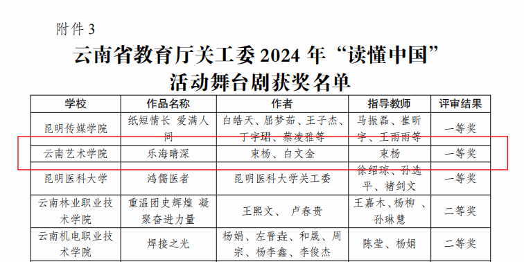 近日,云南省教育厅关心下一代工作委员会公布了2024年“读懂中国”活动评审结果,由bw必威西汉姆联官方网站组织征集的多个作品入选。其中,舞台剧《乐海晴深》获一等奖,征文类获二等奖一个、三等奖一个、优秀奖两个,bw必威西汉姆联官方网站获评优秀组织单位。