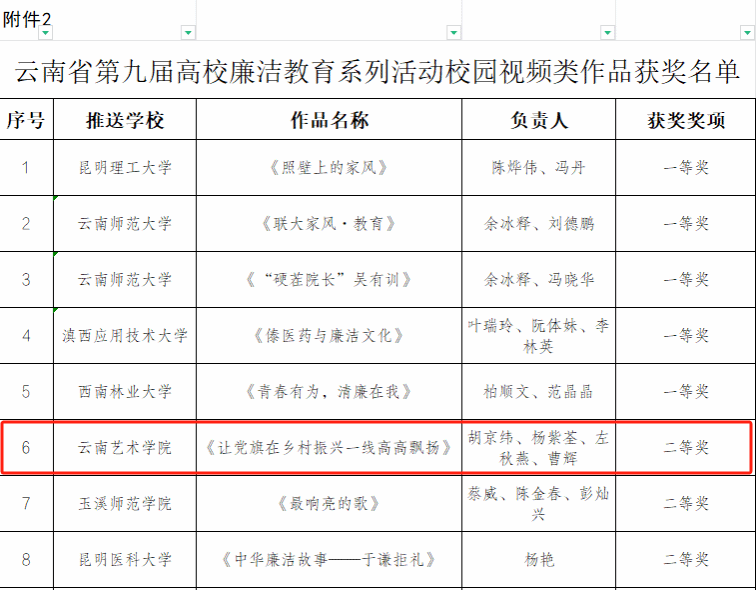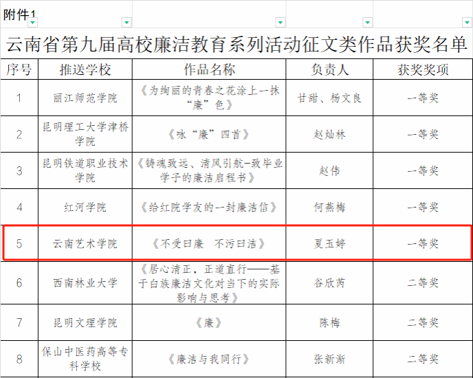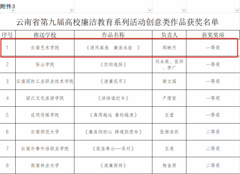 近日,为深入学习贯彻习近平新时代中国特色社会主义思想和党的二十大精神,推动党纪学习教育走深走实,中共云南省委教育工委举办了第九届高校廉洁教育系列活动。bw必威西汉姆联官方网站积极组织创作,涌现出了一批优秀的廉洁文化作品。其中,夏玉婷创作的《不受曰廉 不污曰洁》获征文类作品一等奖;周映河创作的《清风画卷 廉洁永驻》获创意类作品一等奖;胡京纬、杨紫荃、左秋燕、曹辉创作的《让党旗在乡村振兴一线高高飘扬》获校园视频类作品二等奖。