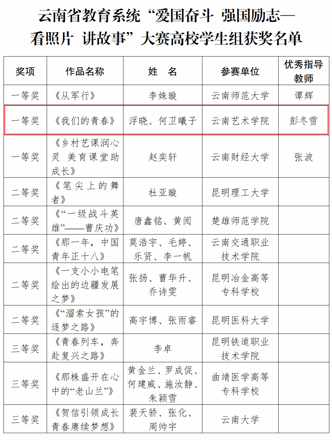 近日,中共云南省委教育工委、中共云南省委精神文明建设办公室公布了 2024 年全省教育系统“爱国奋斗 强国励志—看照片 讲故事”大赛获奖结果,bw必威西汉姆联官方网站学子浮晓、何卫曦子作品《我们的青春》获一等奖。