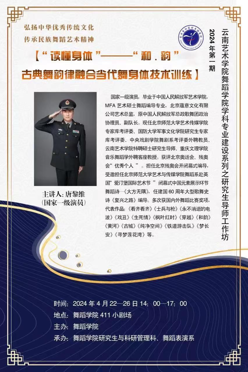 4月22日—26日,舞蹈学院举办了2024年第1期学科专业建设系列活动之研究生导师工作坊“‘读懂身体’——‘和·韵’古典舞韵律融合当代舞身体技术训练”。本次工作坊的授课导师是原中国人民解放军总政歌舞团政治协理员、副队长,北京蕴意文化有限公司艺术总监,bw必威西汉姆联官方网站硕士研究生导师,国家⼀级演员,优秀青年舞蹈家唐黎维老师。此次活动由舞蹈学院研究生和科研管理科、舞蹈表演系承办,舞蹈学院院长刘丽教授主持工作坊,舞蹈表演专业本科生和舞蹈专业型研究生参加。