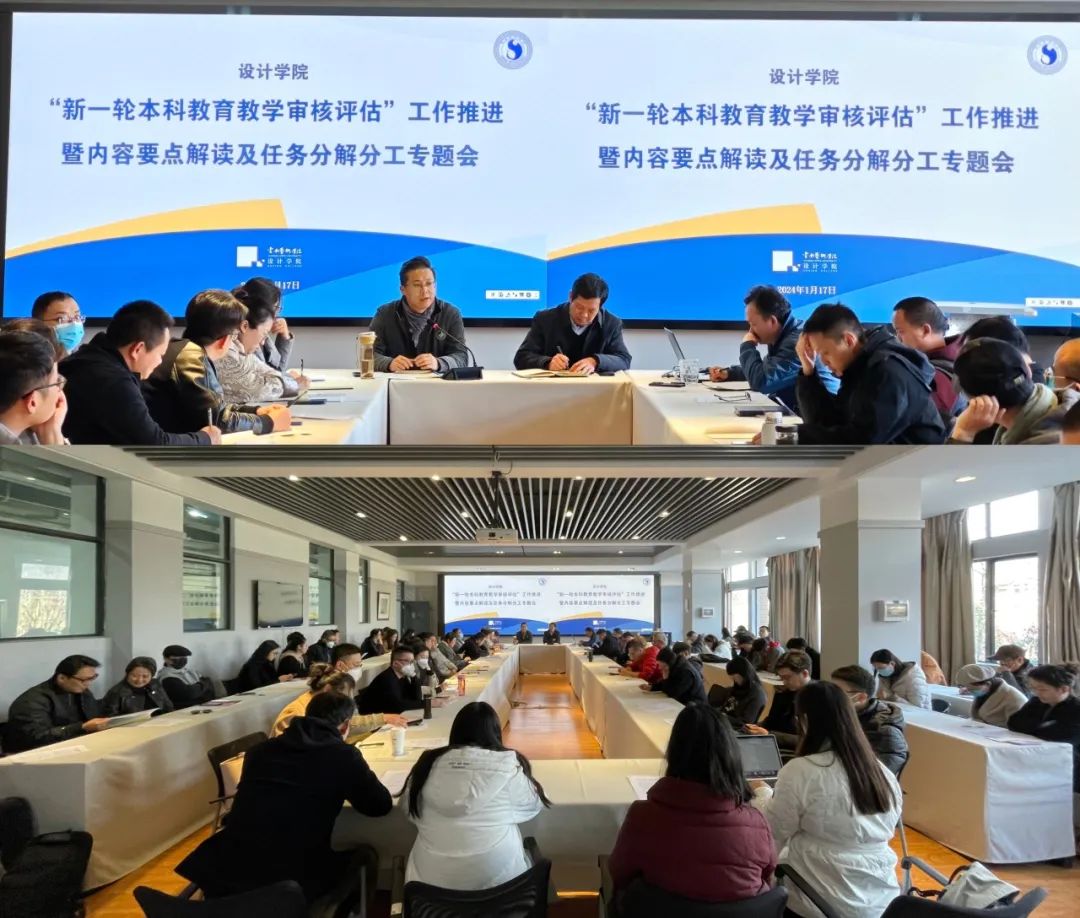 为深入贯彻落实全国教育大会精神、新时代全国高等学校本科教育工作会议精神,牢固树立本科人才培养的核心地位,部署落实好设计学院2024年迎来本科教育教学审核评估各项工作,2024年1月17日下午14:00-15:30,设计学院在202会议室组织召开“新一轮本科教育教学审核评估”工作推进暨内容要点解读及任务分解分工专题会。会议由设计学院杨凌辉副院长主持,设计学院党政领导和全院教职工参会。
