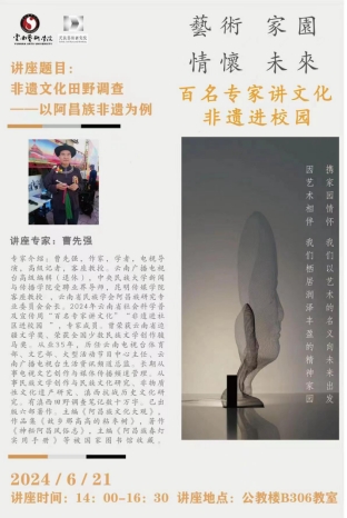 2024年6月21日14:00,民族艺术研究院“百名专家讲文化”活动“非遗进校园”讲座顺利开讲,本次讲座由云南广播电视台高级编辑(已退休),中央民族大学新闻与传播学院受聘业界导师,昆明传媒学院客座教授,云南省民族学会阿昌族研究专业委员会会长、阿昌族学者曹先强教授主讲,讲座主题为《“赓续优秀传统文化,传承民族非遗经典”非遗田野调查研究——以阿昌族为例》。