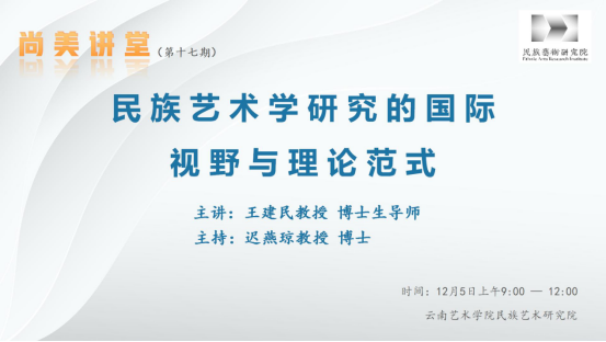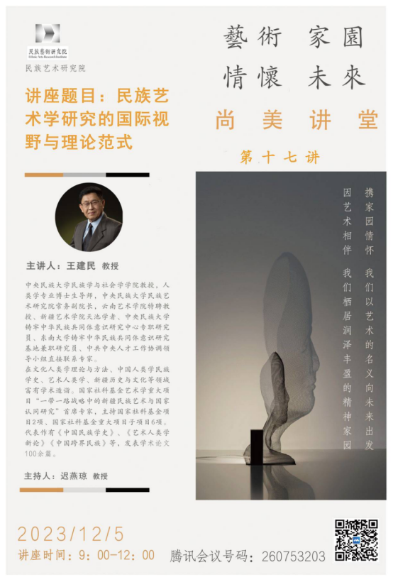 2023年12月5日9:00,民族艺术研究院尚美讲堂系列讲座第十七讲顺利开讲,本次讲座由中央民族大学民族学与社会学学院教授,人类学专业博士生导师,中央民族大学民族艺术研究院常务副院长,bw必威西汉姆联官方网站特聘教授王建民主讲,讲座主题是《民族艺术学研究的国际视野与理论范式》。讲座由民族艺术研究院党总支书记迟燕琼教授主持,民族艺术研究院教师代表及全体研究生参加了此次讲座。