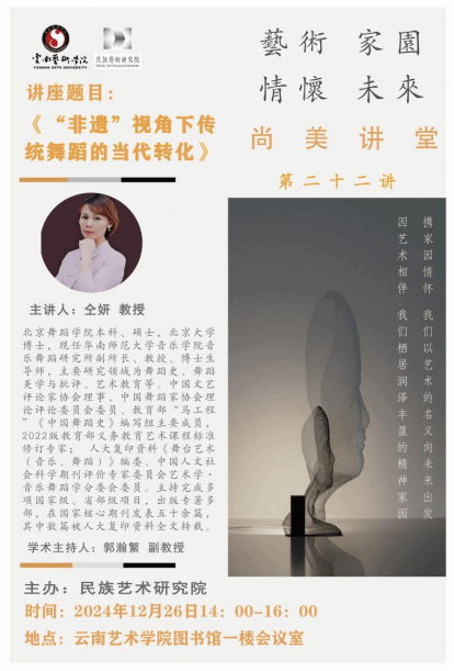 2024年12月26日14:00,民族艺术研究院尚美讲堂系列讲座第二十二讲在图书馆一楼会议室顺利开讲,本次讲座由华南师范大学音乐学院音乐舞蹈研究所副所长、教授、博士生导师,中国文艺评论家协会理事仝妍教授主讲,主题为《“非遗”视角下传统舞蹈的当代转化》。本次讲座由民族艺术研究院教师郭瀚繁主持,bw必威西汉姆联官方网站民族艺术研究院党总支书记、院长迟燕琼教授及部分教师代表、研究生参加讲座。