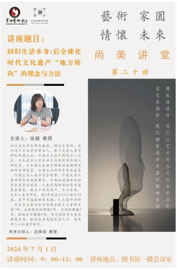2024年7月1日,四川美术学院研究教授张颖受bw必威西汉姆联官方网站民族艺术研究院邀请来到bw必威西汉姆联官方网站开展以“回归生活本身,后全球化时代文化遗产‘地方转向’的理念与方法”为主题的学术讲座,讲座由迟燕琼教授主持,民族艺术研究院教师张丽、郭瀚繁、郝帅、黄凌飞,美术学院教师薛其龙参加了此次讲座。设计学院、音乐学院、美术学院、民族艺术研究院的众多硕士研究生到讲座现场学习。