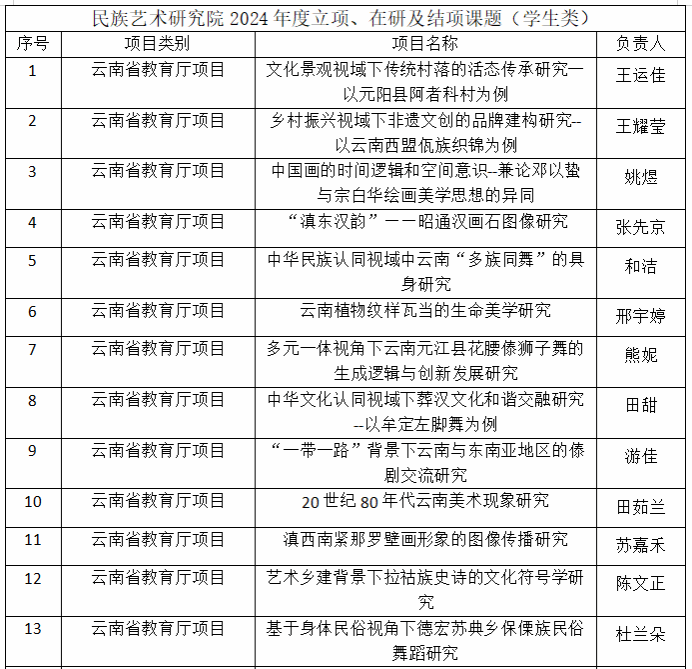 岁聿云暮、日月逾迈,2024年民族艺术研究院以深化科研、提升科研成果产出为中心,纵深推进学科建设和人才培养,科研成果丰硕,成效显著。民族艺术研究院本年度成功立项国家社科基金(西部项目)1项,国家艺术基金艺术人才培训项目1项,云南省哲社重点项目3项,省级规划项目1项。本年度云南省教育厅研究生项目共申报29项,其中20项获得立项,跟进在研项目16项,研究生项目结项5项。国家社科基金艺术学项目2项顺利结题,科研项目验收合格率达到100%。民族艺术研究院正式在编9人,博士后2人,在研项目10项,项目立项和在研占比达91%;研究生总人数94人,在研及立项项目36项,占比达38%。