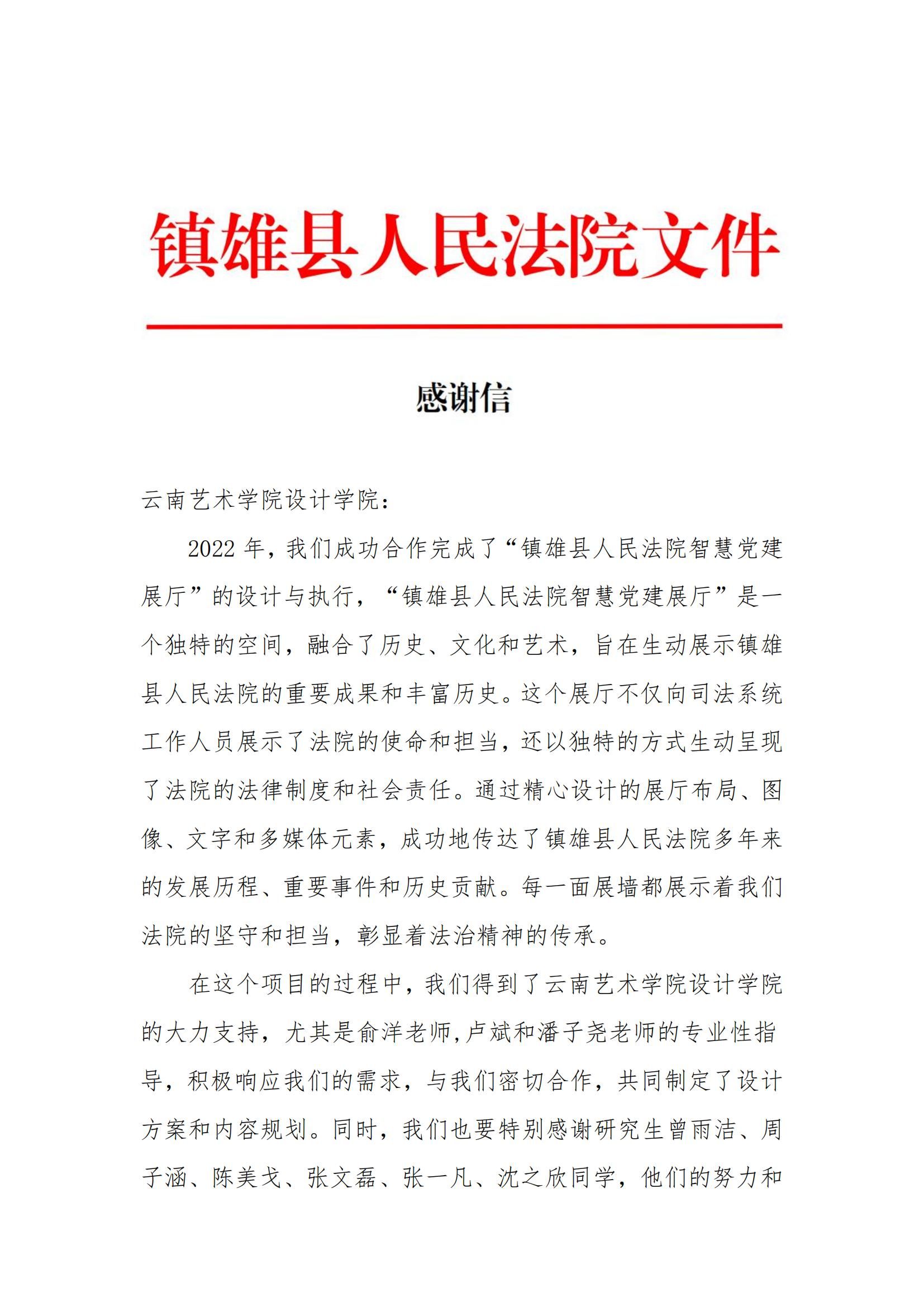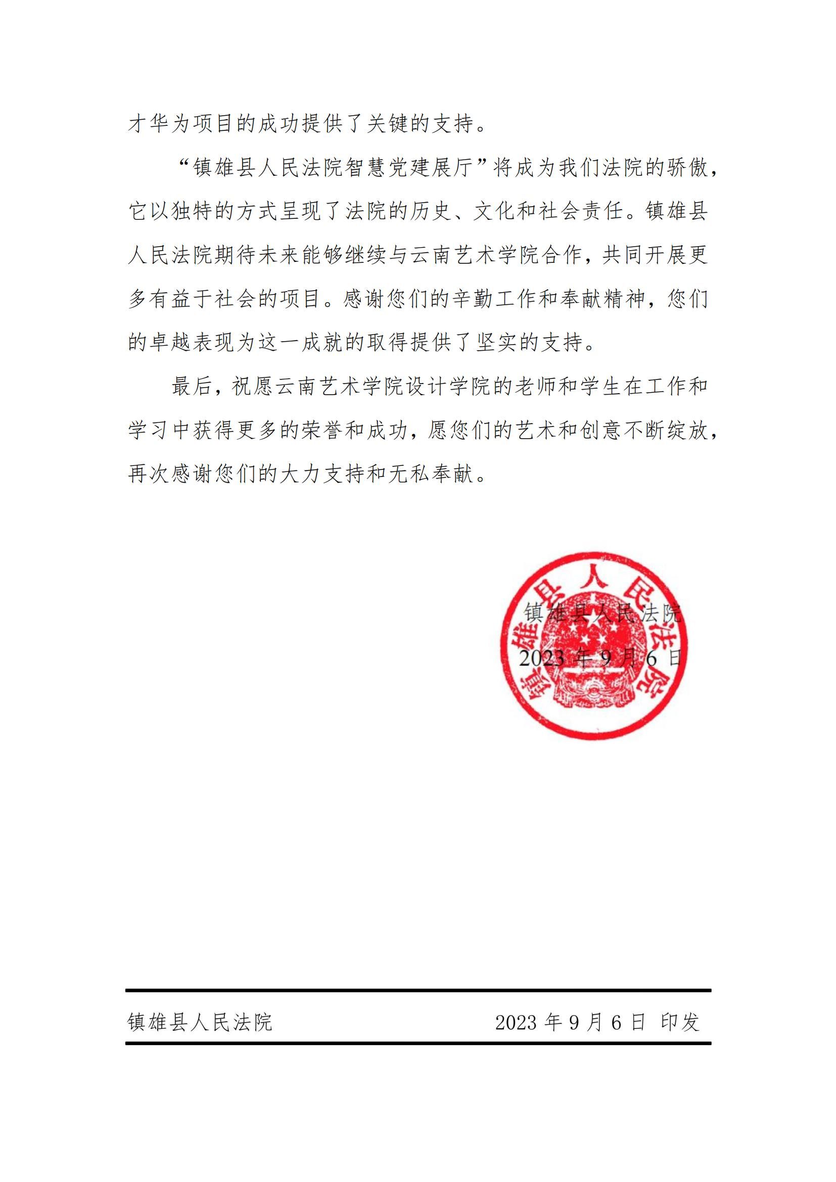 在信息化与智慧化浪潮席卷全球的今天,智慧党建作为新时代党建工作的新引擎,正逐步成为提升党建工作效能、强化党员教育管理的关键力量。bw必威西汉姆联官方网站设计学院积极响应国家智慧党建建设的号召,于2021年启动了与云南镇雄县人民法院的深度合作,旨在通过设计专业的力量,为智慧党建展厅的设计与实施注入新的活力。在此过程中,收到了来自镇雄县人民法院的感谢信,对学院表示衷心的感谢和崇高的敬意。