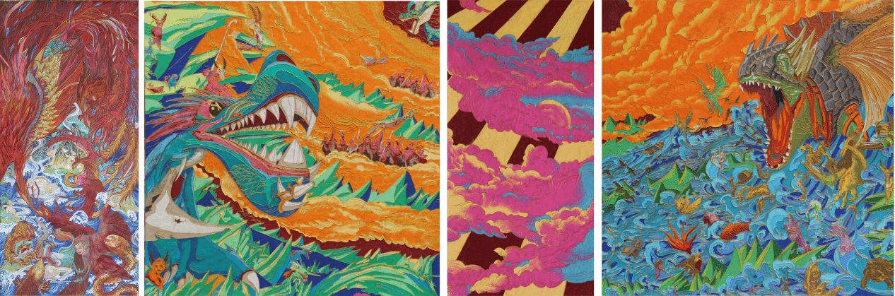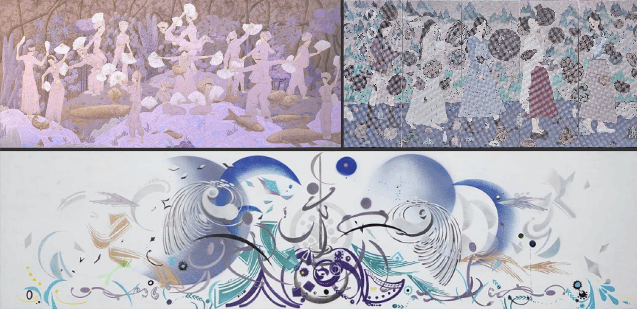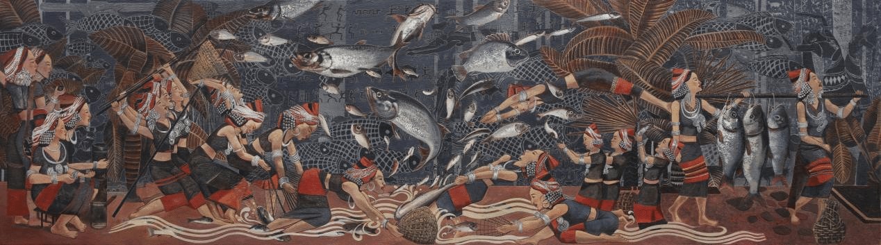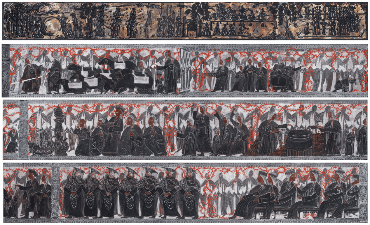 《铸牢中华民族共同体意识——孟连神鱼节》360×90cm 布面综合材料绘画 2024年 王洪云 彭飞 周扬