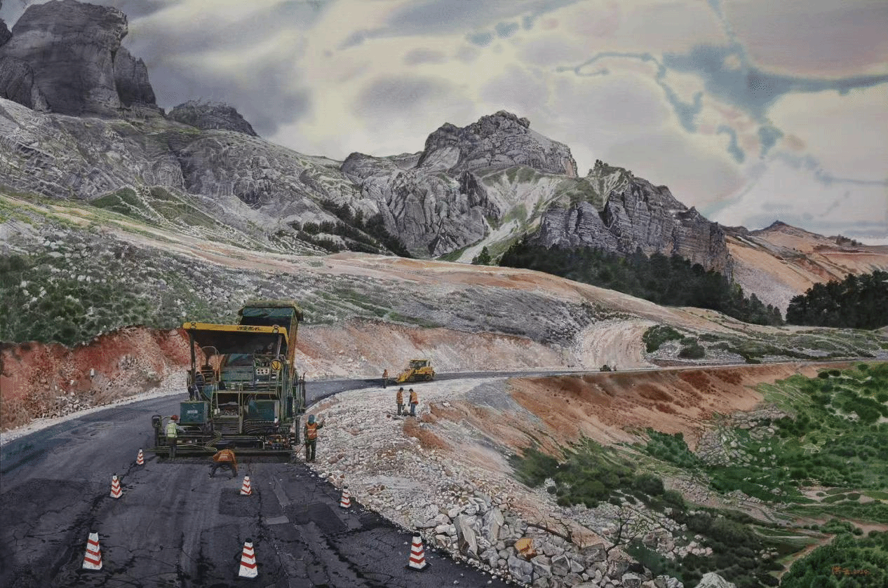 《高原筑路人---拓跋》 110cm×150cm 纸本水彩 2024年 王洪云
