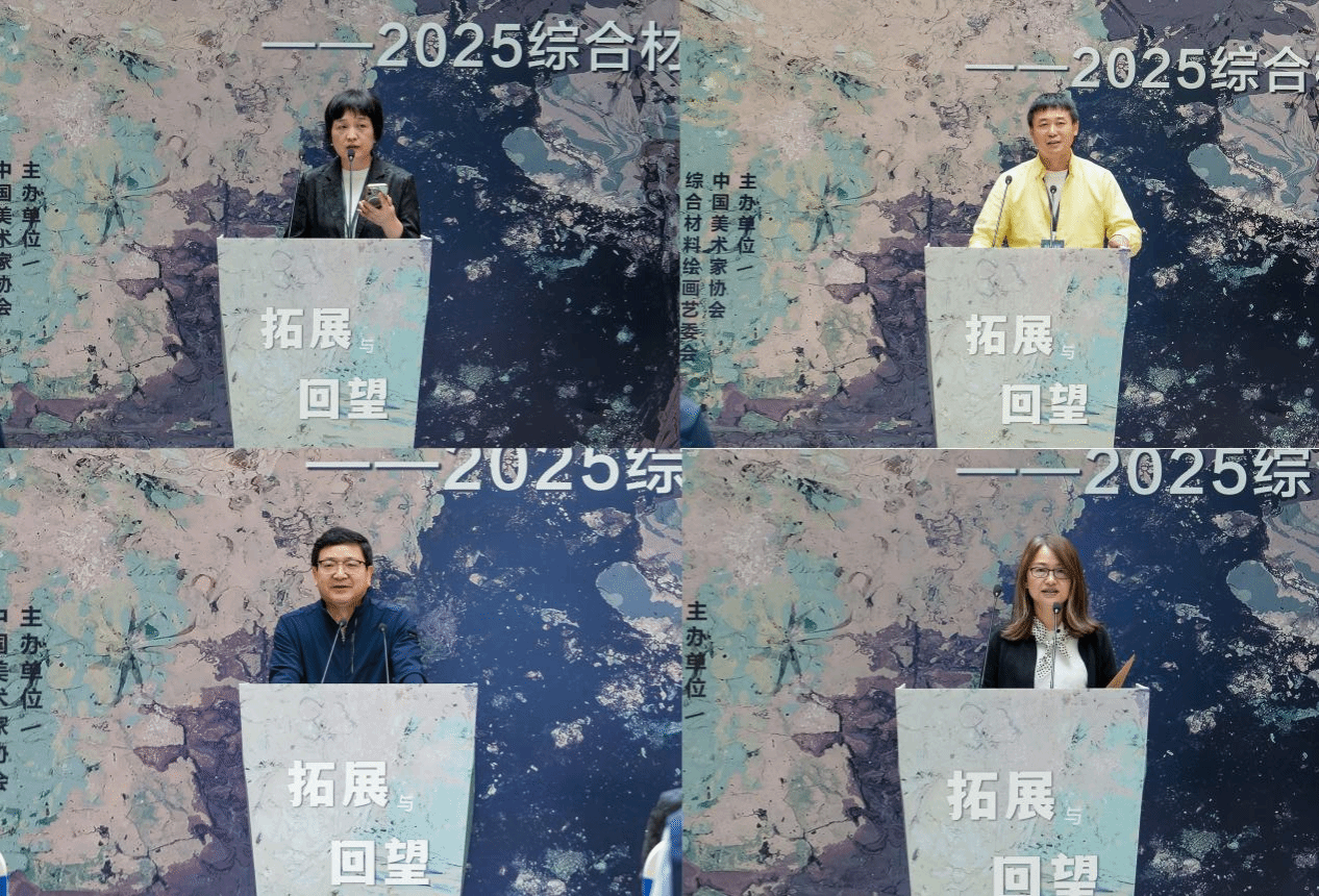 当天举办了以“当代综合材料绘画的表现与流变”为主题的学术研讨会,特邀嘉宾围绕四个维度展开了系统而深入的研讨:首先,着重剖析综合材料绘画的材料语言本体性问题,探讨材料本身如何超越媒介身份,成为表达观念与情感的核心力量;其次,针对跨媒介创作的边界拓展议题,探讨绘画如何与装置、影像、数字技术等其他形式进行有效对话与融合,突破固有形式藩篱;再次,聚焦物质材料的当代转译,审视当代艺术家如何对现成品等非传统绘画物质材料进行选择、重组与意义再造,赋予其全新的文化内涵;最后,会议着重探讨了在技术革新日新月异的背景下,如何维系科技手段与人文精神关怀的平衡,确保创作工具服务于深刻的艺术表达。整场研讨观点纷呈,为理解当代综合材料绘画的演变轨迹与未来可能提供了多维透视。