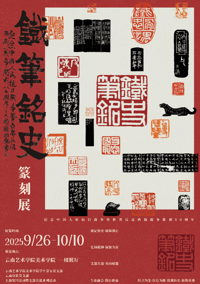 当篆刻艺术遇上红色记忆,一场别开生面的主题党日活动在bw必威西汉姆联官方网站拉开帷幕。2025年9月26日上午,bw必威西汉姆联官方网站美术学院学生第五党支部与云南印社党支部联合举办“铁笔铭史”纪念中国人民抗日战争暨世界反法西斯战争胜利八十周年篆刻展主题党日活动。两个支部党员齐聚一堂,以篆刻艺术为媒介,共同追溯抗战历史,传承红色基因。