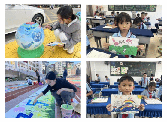2025年10月9日,我主导校园防护墩涂鸦工作,将中国传统文化与坡芽符号融入创作,让学生在熟悉的本土文化中理解家乡特色,避免对传统文化的 “陌生感”,同时形成独特的校园文化符号,提升学校文化影响力。2025年11月15日,参与学校百米绘画比赛筹备,和其他教师一起为学生描绘轮廓、修改作品,激发学生艺术创造力,挖掘本土文化魅力。2025年11月17日,参与富宁县第四小学第八届体育艺术节场地布置,搭建师生亲子互动平台,营造和谐向上的校园氛围。