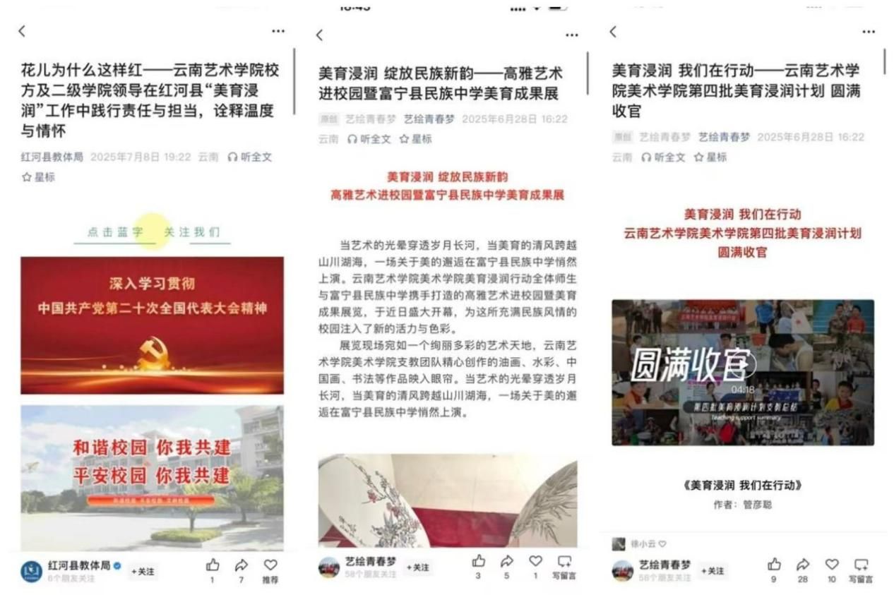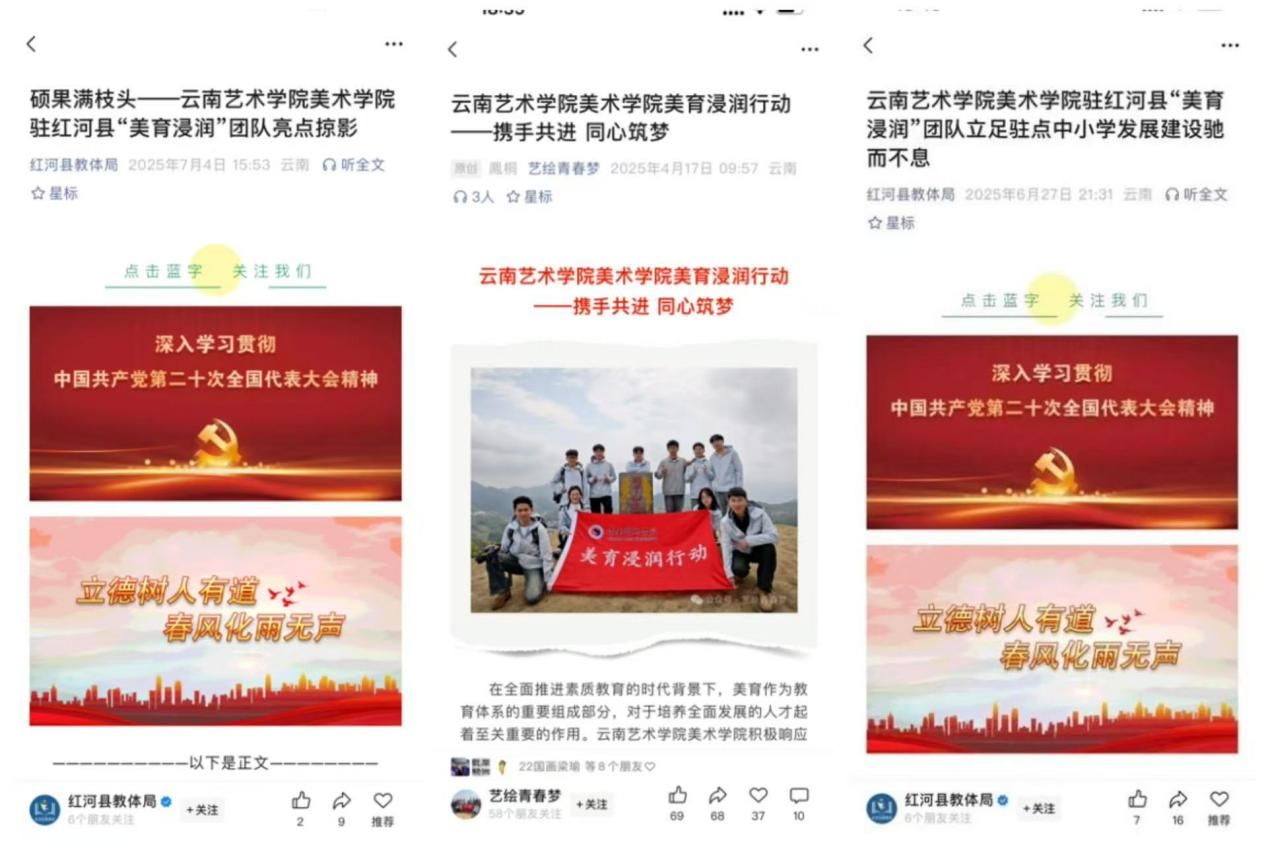 本年度在教学和创作实践外,费秋生老师驻红河县带队指导教师,徐小云老师驻富宁县带队指导教师积极践行美育浸润计划,全面提升师生综合素养,积极践行服务社会的职责。中国画专业教师参与云南省教育厅组织的“美育浸润计划”“中国书画名家进校园”“社区书画公益课”等志愿活动,通过为中小学美术教师、中小学生、社区居民讲解中国画基础知识和创作进行示范技法,普及中国书画艺术,同时也锻炼了沟通表达与教学实践能力。