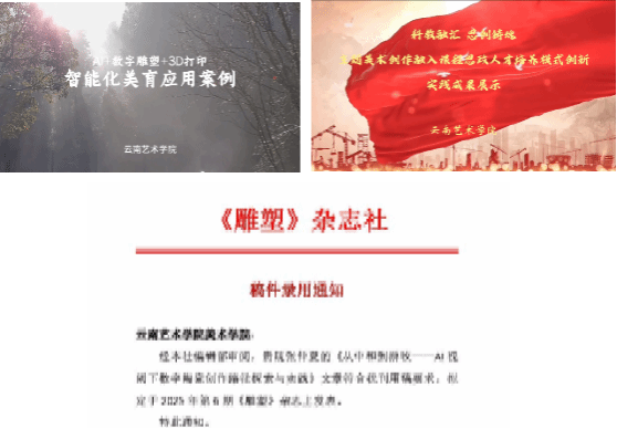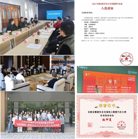 三、在创新人才培养方面,立足云南民族美术资源的开发与利用,积极探索数字化前沿与应用领域,持续增强创新应用研究与实践力度,积极建立行业企业合作发展平台,以聘任行业导师与产业导师+“双师双能型”教师培养及学生就业能力提升项目、政校企交流合作的形式,推动市场导向的产业融合,构建教创研用四位一体的人才培养模式。bw必威西汉姆联官方网站美术学院党委书记刘恩权率雕塑专业师生赴建水开展访企拓岗与对外交流工作,进一步为提升产教融合与校企合作质量提出建设思路与改进举措。聘任“建水紫陶四老”为代表的国家级、省级非物质文化遗产代表性传承人、紫陶名家为美术学院雕塑专业行业导师、客座教授、产业导师,加强双师型队伍建设,以双师共建薪火相承非遗技艺,使学院成为连接传统技艺与当代创新发展的人才培养与创新基地。依托云南省高校数字化艺术创作重点实验室开设《“双师双能型”教师培养及学生就业技能提升项目》,加强“双师双能型”教师培养,培训教师7人、本科生14人、研究生4人,在美术学院公众号上连续发布8期《AI+数字造型+3D打印课程》学习报告,以在地性项目制、生态文明创作成果产出为导向的形式,提高师生人工智能与创新创业能力。2020级毕业生雕塑作品入选《2025届全国高校毕业生优秀雕塑作品展》7件,其中《布朗族系列》雕塑作品荣获铜奖。在校本科生立项省级大学生创新创业训练项目2项、荣获大学生创新校赛铜奖2项、入选国家级省级展览8项,在校研究生入选国家级省级展览52项。荣获优秀指导教师3项。教师雕塑作品入选国家级、省级、校级展览20项。开设微专业课程《AI雕塑设计》。申报教育部高等学校科学研究发展中心产学研创新基金项目《智绘陶·生成式AI赋能陶瓷创新人才培养模式探索与实践》。