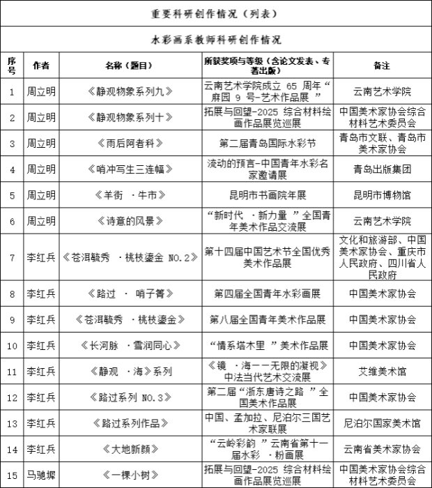 系主任周立明老师在本年度多次担任专业评审与指导工作,包括出任云南省第十一届水彩·粉画展评委, 以及担任云南省美术家协会创作骨干培训班及新会员培训的指导教师 ,积极助推地方美术人才培养。其个人创作亦获得肯定 ,荣获第十届云南文学艺术奖 ·云南美术奖银奖。