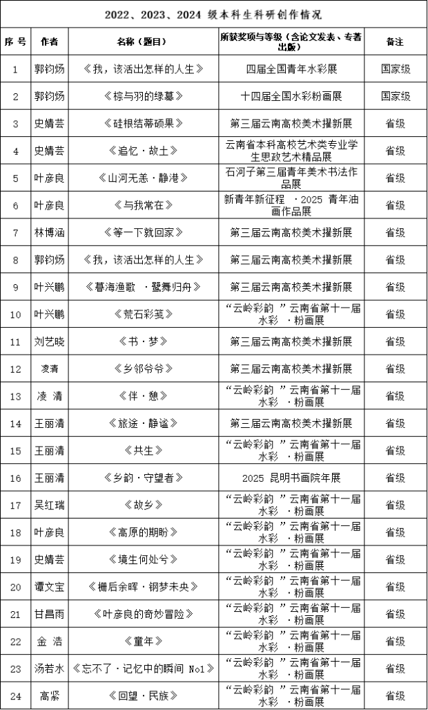本科生作品在“ 第三届云南高校美术擢新展”“云岭彩韵 ·云南省第十一届水彩 ·粉画展” 等省级展览中大量入选并获好评 ,部分优秀作品更是跻身“ 第十四届全国水彩粉画展”,“ 第四届全国青年水彩画展” 等国家级展览平台 ,展现出扎实的专业基础与活跃的创作思维。