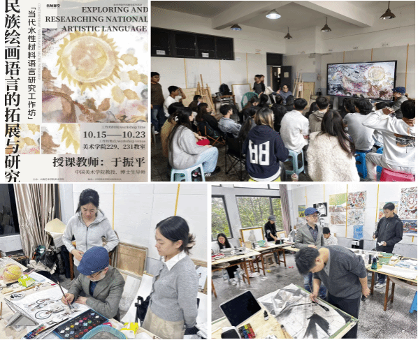 为深化对水性材料绘画语言的学术探索,水彩画系于10月中旬成功承办了由中国美术学院于振平教授主讲的《民族绘画语言的拓展与研究——当代水性材料语言研究工作坊》。该工作坊聚焦材料、技法与观念的交融 ,通过系统讲授与实践指导 , 引导师生深入思考民族艺术元素在当代水彩创作中的转化与表达。