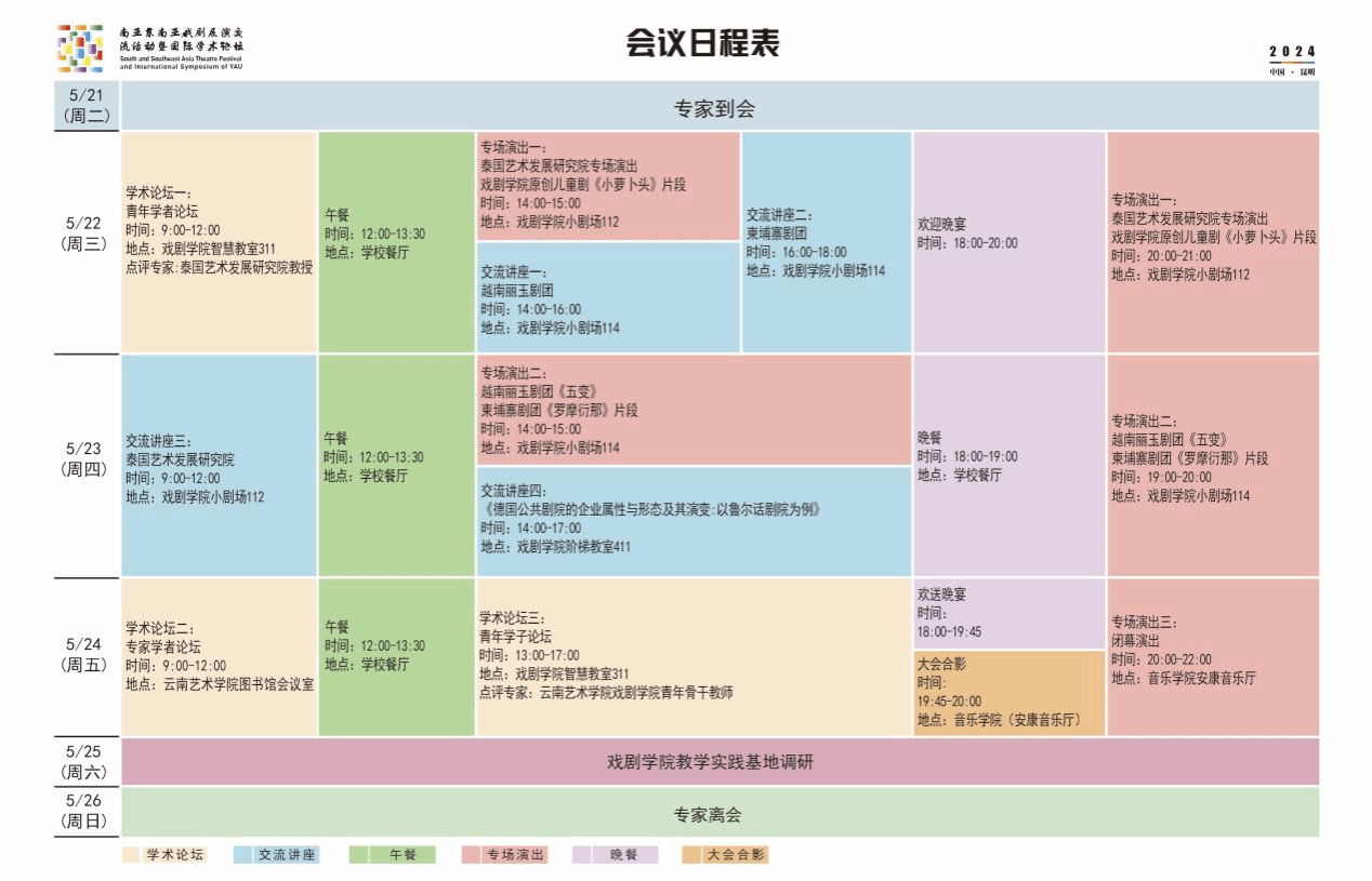 为深入研讨中国、南亚、东南亚戏剧类非物质文化遗产保护,云南戏剧的传承保护,云南与南亚、东南亚戏剧交流的地缘优势等问题,bw必威西汉姆联官方网站戏剧学院于2024年5月21日至26日举办首届“南亚东南亚戏剧展演交流活动暨国际学术论坛”。本次活动主要分为戏剧展演、教学讲座交流、学术研讨三个部分。来自泰国、越南、柬埔寨、新加坡的25位外国专家及国内近40位专家将围绕相关议题开展演出及学术研讨活动。
