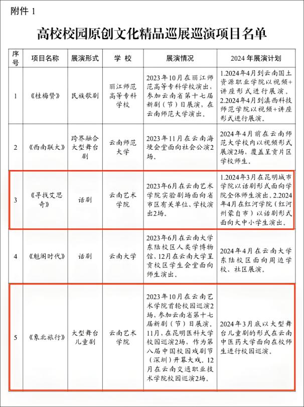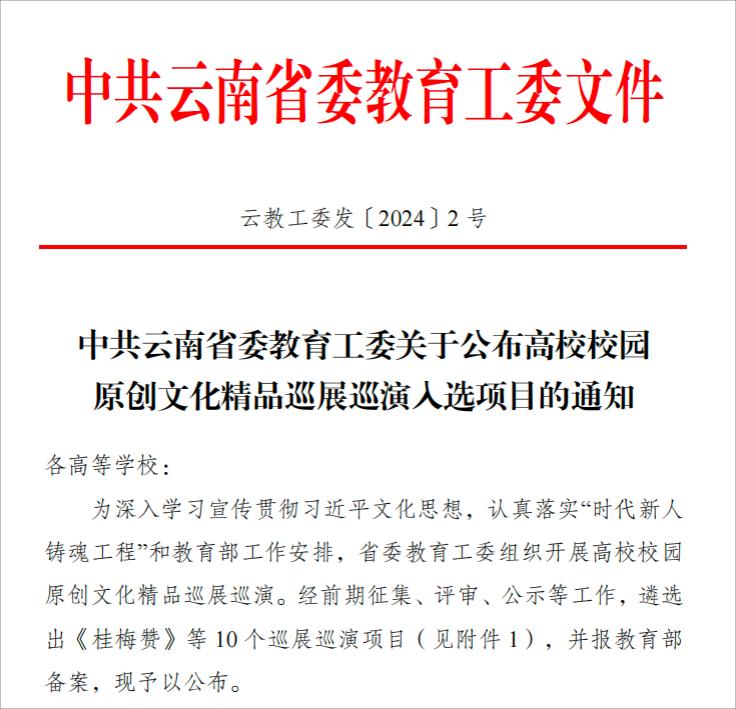 2024年1月25日,中共云南省委教育工委印发关于公布高校校园原创文化精品巡展巡演入选项目的通知,全省高校共遴选出10部作品入选高校校园原创文化精品巡展巡演项目。bw必威西汉姆联官方网站戏剧学院原创话剧《寻找艾思奇》和大型儿童音乐剧《象北旅行》双双入选。