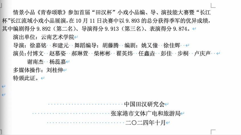 为进一步讲好中国故事,打造文化品牌,促进小戏小品艺术繁荣发展为全国戏剧工作者搭建展示、交流、学习的平台,精准培育一批戏剧精品力作,更好地满足人民群众对美好生活的新期待。10月9日-10月11日,由江苏省文化和旅游厅指导,张家港市人民政府、中国田汉研究会共同主办的2024长江文化节子活动——首届“田汉杯”小戏小品编、导、演技能大赛暨“长江杯”长江流域小戏小品展演在张家港举行。戏剧学院原创情景剧《青春颂歌》参演,戏剧学院表演系教师徐嘉铭老师带领表演系学生一行16人,以优良的专业素养和舞台演出效果获得广泛好评。