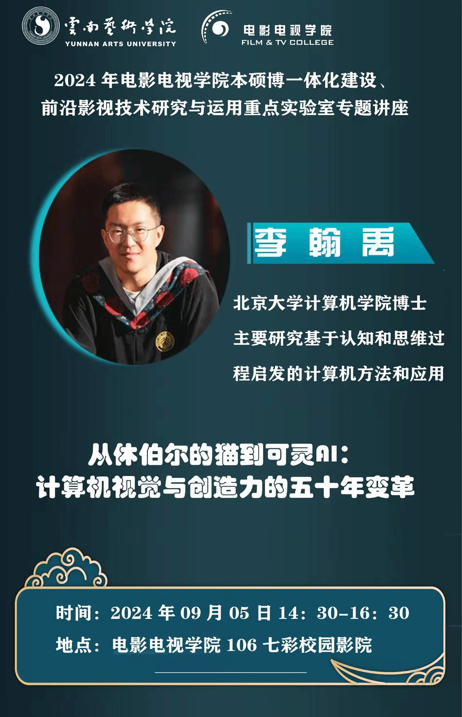 2024年9月5日下午,bw必威西汉姆联官方网站云南省高校前沿影视技术研究与运用重点实验室邀请北京大学计算机学院的博士生李翰禹开展讲座。主题内容为:“从休伯尔的猫到可灵AI:计算机视觉与创造力的五十年变革”。此次讲座为2024 年电影电视学院本硕博一体化建设、前沿影视技术研究与运用重点实验室专题讲座。电影电视学院副院长、实验室负责人谢波主持讲座。