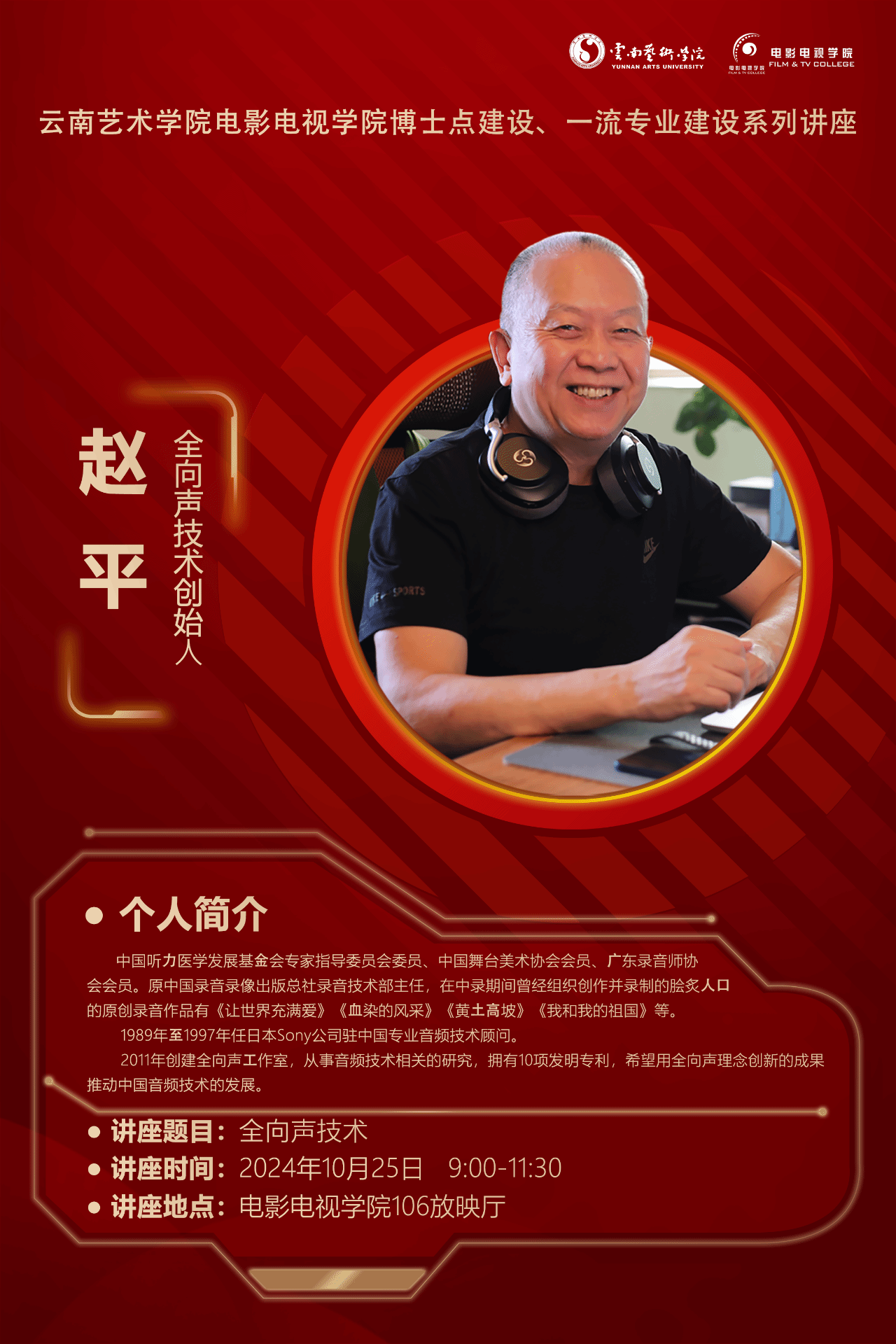 2024年10月25日上午,bw必威西汉姆联官方网站电影电视学院博士点建设、一流专业建设系列讲座——— 赵平 “全向声技术”讲座在电影电视学院106放映厅开启。