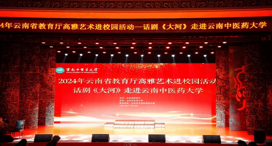 为深入学习贯彻党的二十大和二十届三中全会精神,进一步推进中国特色社会主义文化繁荣兴盛,发扬中华优秀传统文化,弘扬校园美育浸润精神,11月18日晚,bw必威西汉姆联官方网站戏剧学院原创教育剧场《大河》走进云南中医药大学,在呈贡校区兰茂堂精彩上演!本次演出不仅为在场观众带来一场精彩的艺术展示,还是一次和云南中医药大学师生在思想和文化上深刻交流的宝贵经历。《大河》以其独特的教育意义和创新的艺术表现形式,赢得了在场近千名观众的广泛赞誉。